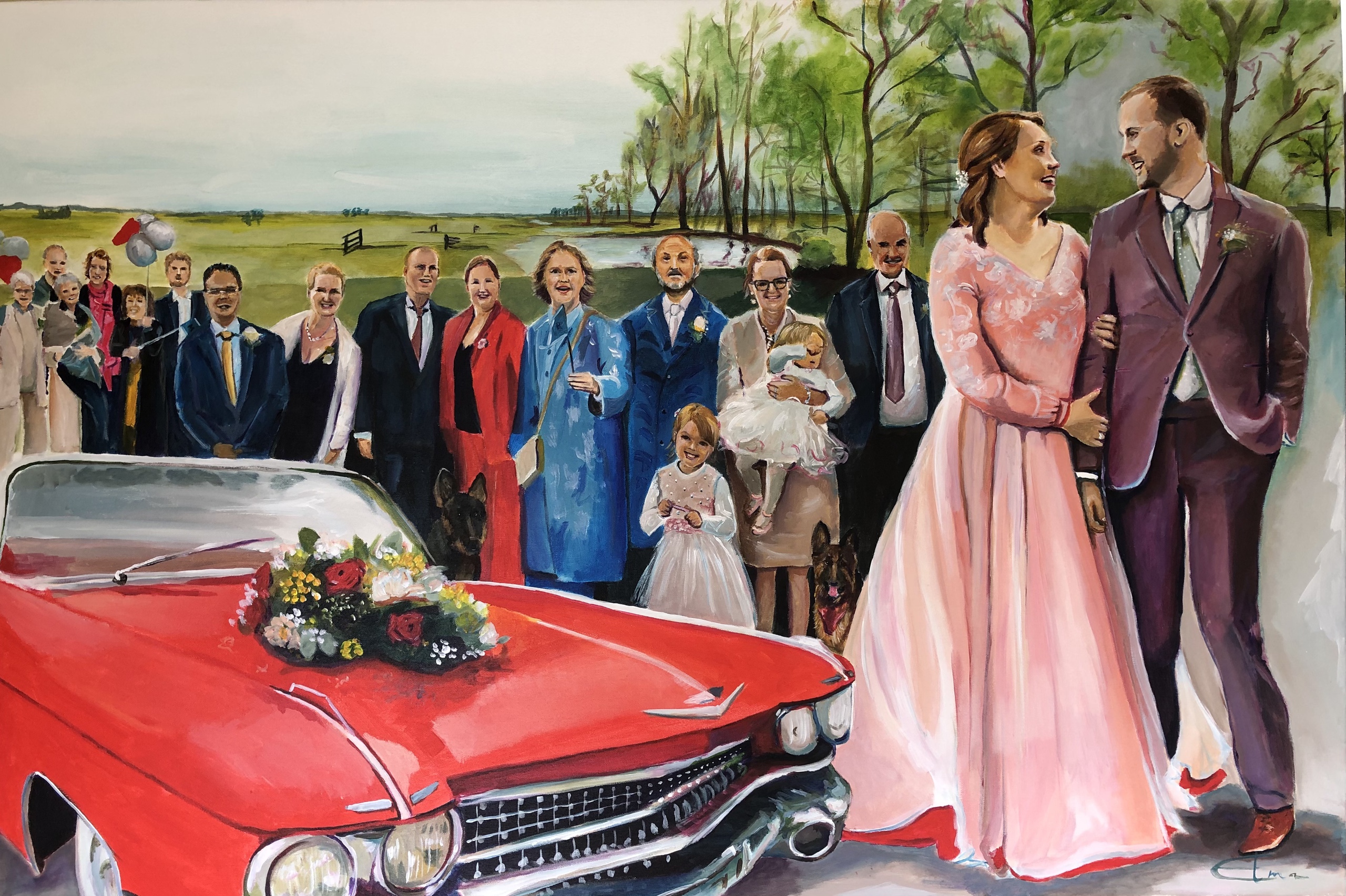 Schilderij Familie Groepsportret Trouwen Trouwdag Bruiloft