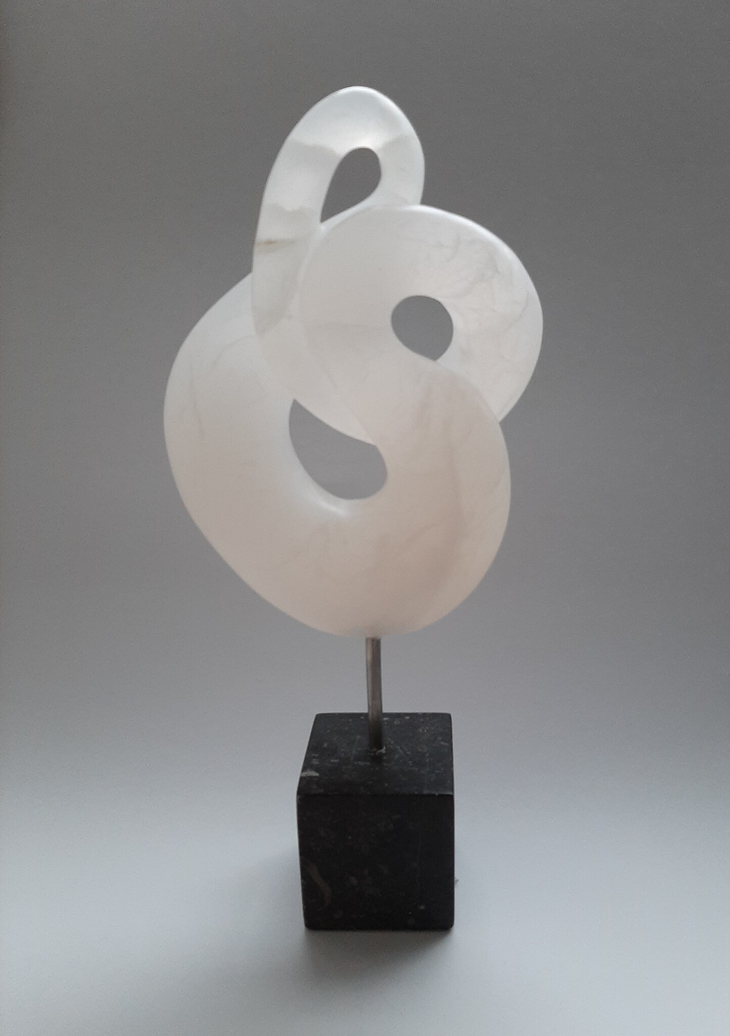 Wit Albast op hardstenen sokkel. In de sfeer van de lemniscaat volgt hier Serenity, deze mooie bijna doorzichtige steen, zacht en wit; rein. Straalt een waardigheid en rust en kalmte uit ondanks de vele ruige scheuren en barsten wat de schoonheid van albast is. Dit werk kan helaas niet worden opgestuurd, het is te fragiel. Alleen afhalen (Dronten).