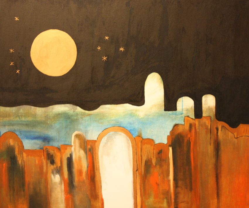Schilderij Modern Zwart Blauw Bruin Maan Groot Hemel Stad