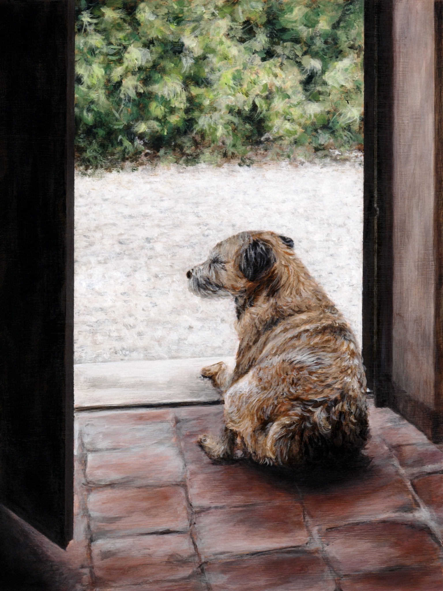 Schilderij Klein Dieren Paneel Acrylverf Verhalend Hond Huisdier Schilderijtje Terrier Border Waken Slaperig Waakhond