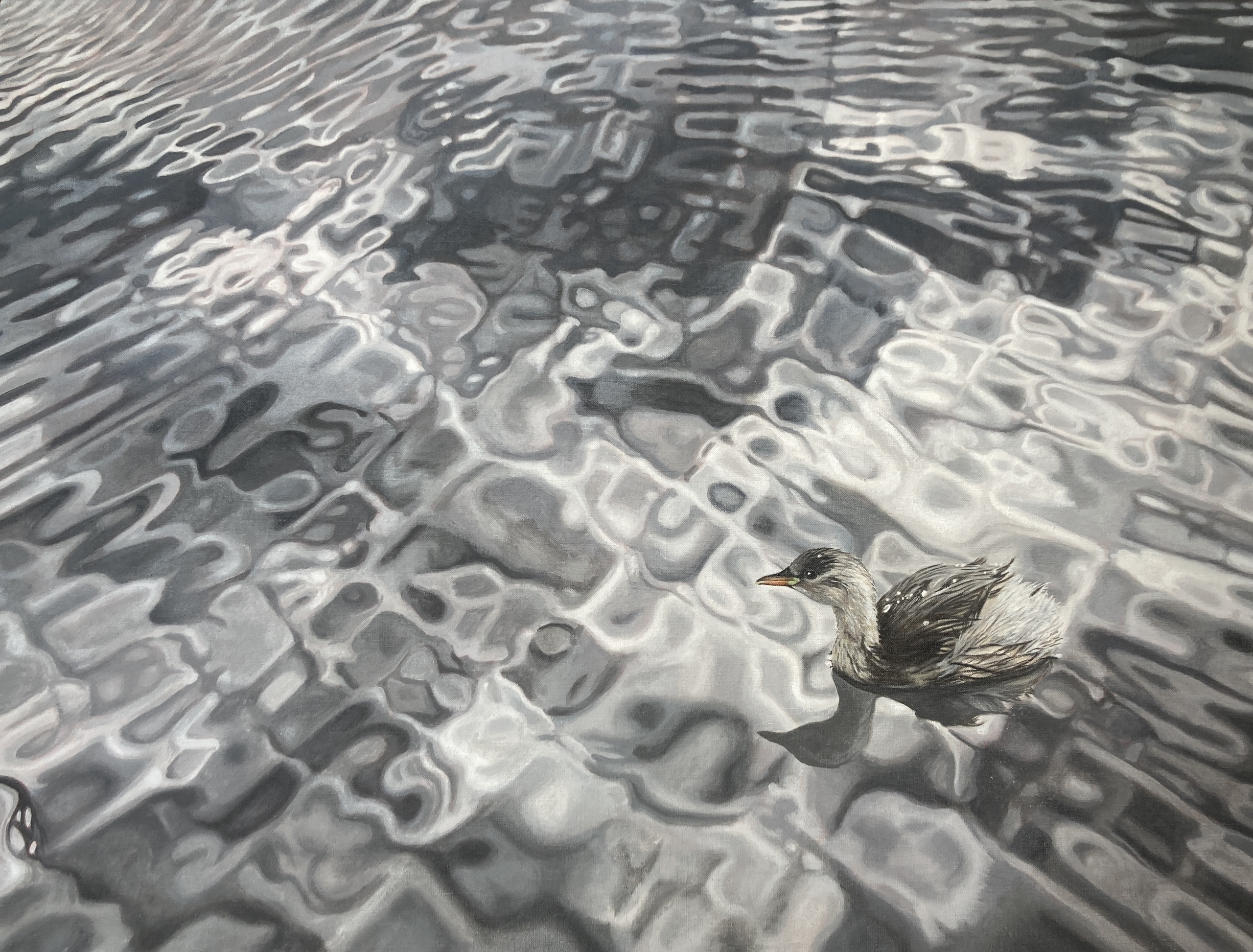Olieverf op linnen. Reflectie van wolkenlucht in kringen in het water, met dodaarsje als bewoner van dit spektakel.