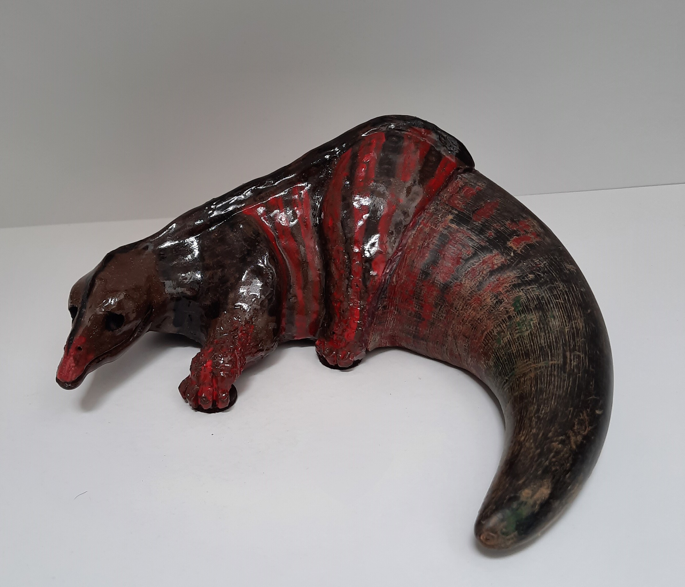 Deze Griebel bestaat voor een deel uit keramiek . De staart is een hoorn van een ander dier, De keramische kant is gemaakt van zwart bakkende chamotte klei en bewerkt met glazuur. De kleuren van de hoorn zijn hierbij leidend geweest.