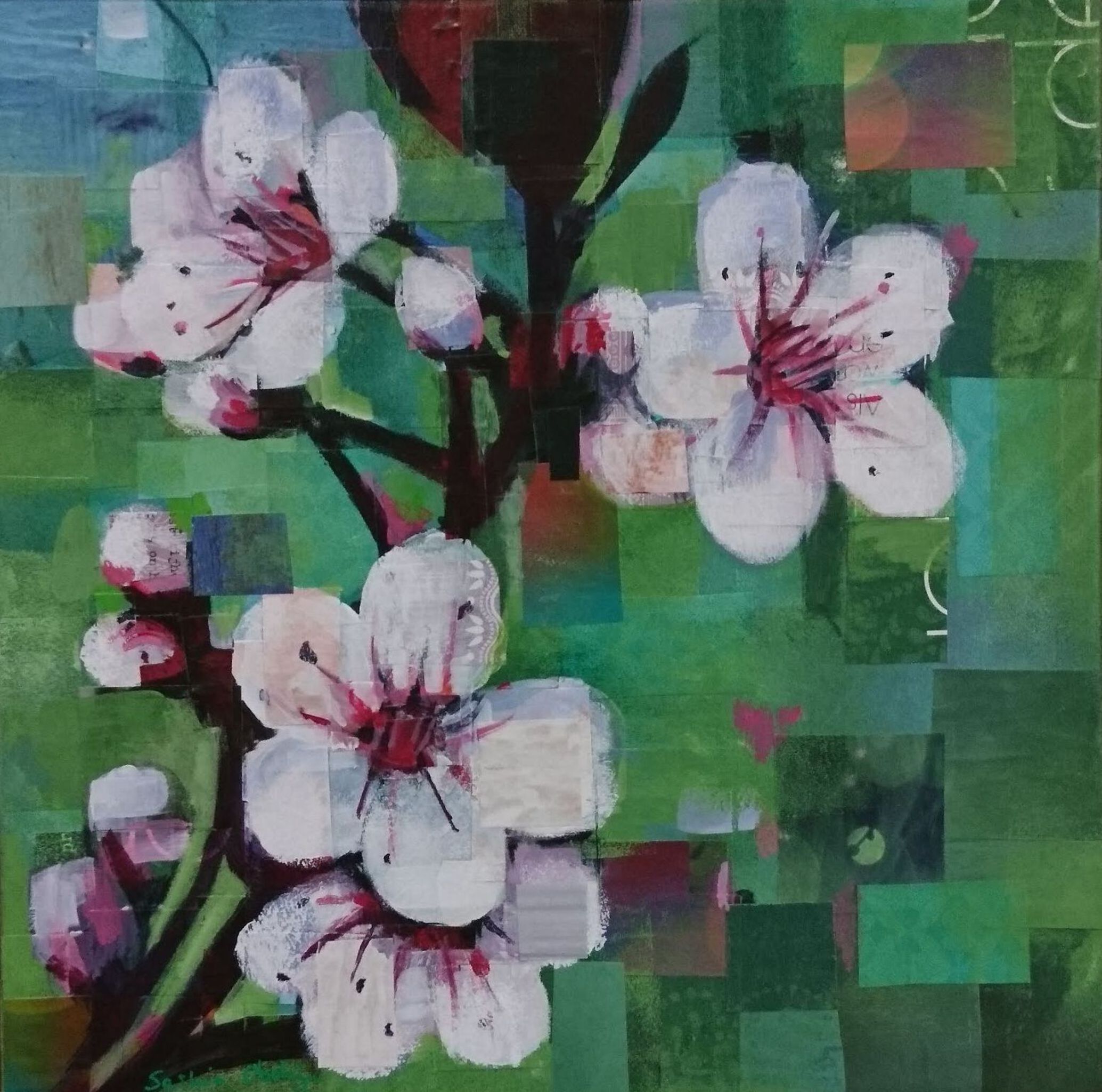 Collage van papier en verf van kersenbloesem