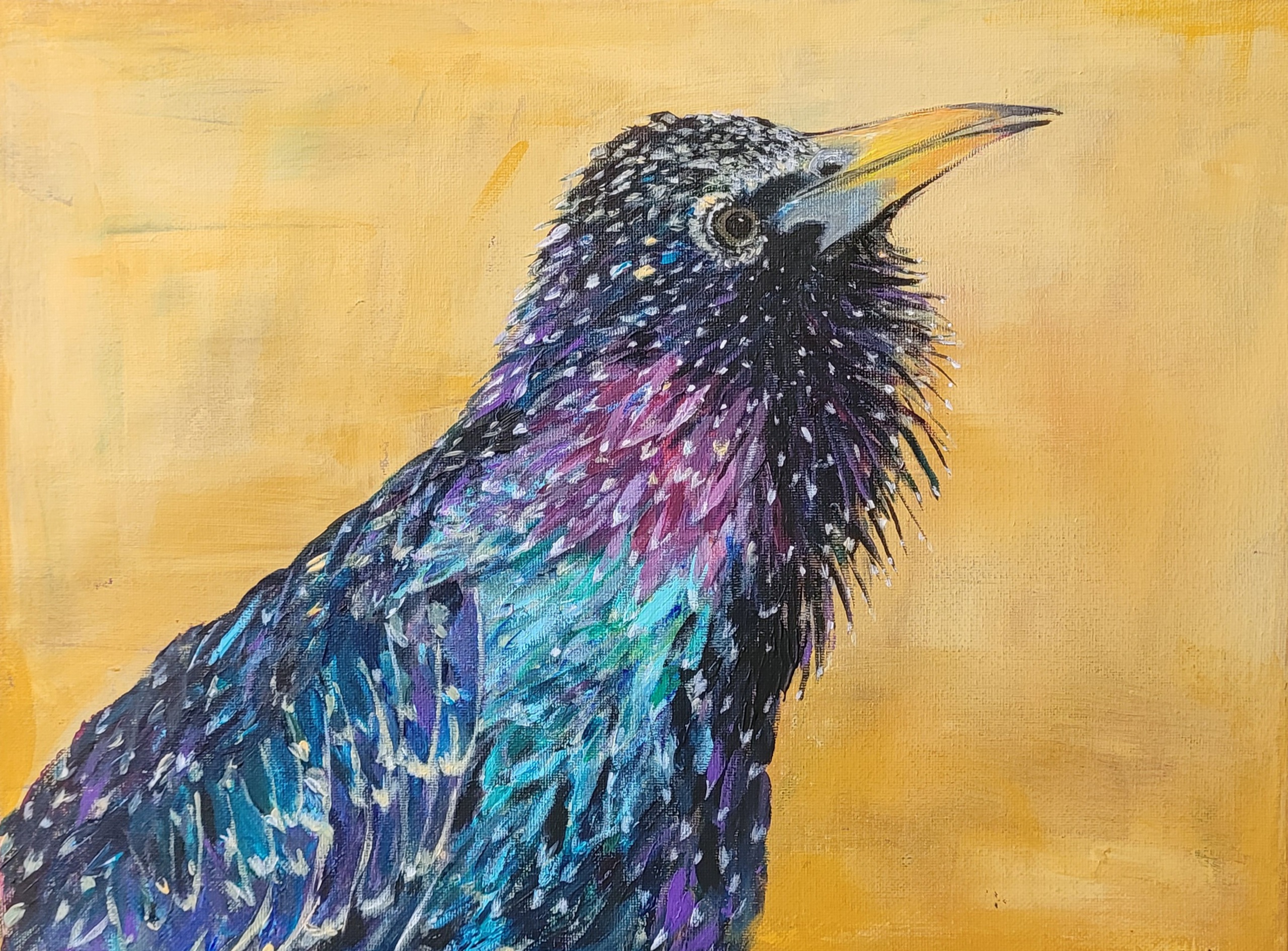 De kleurrijke verendracht van de spreeuw.