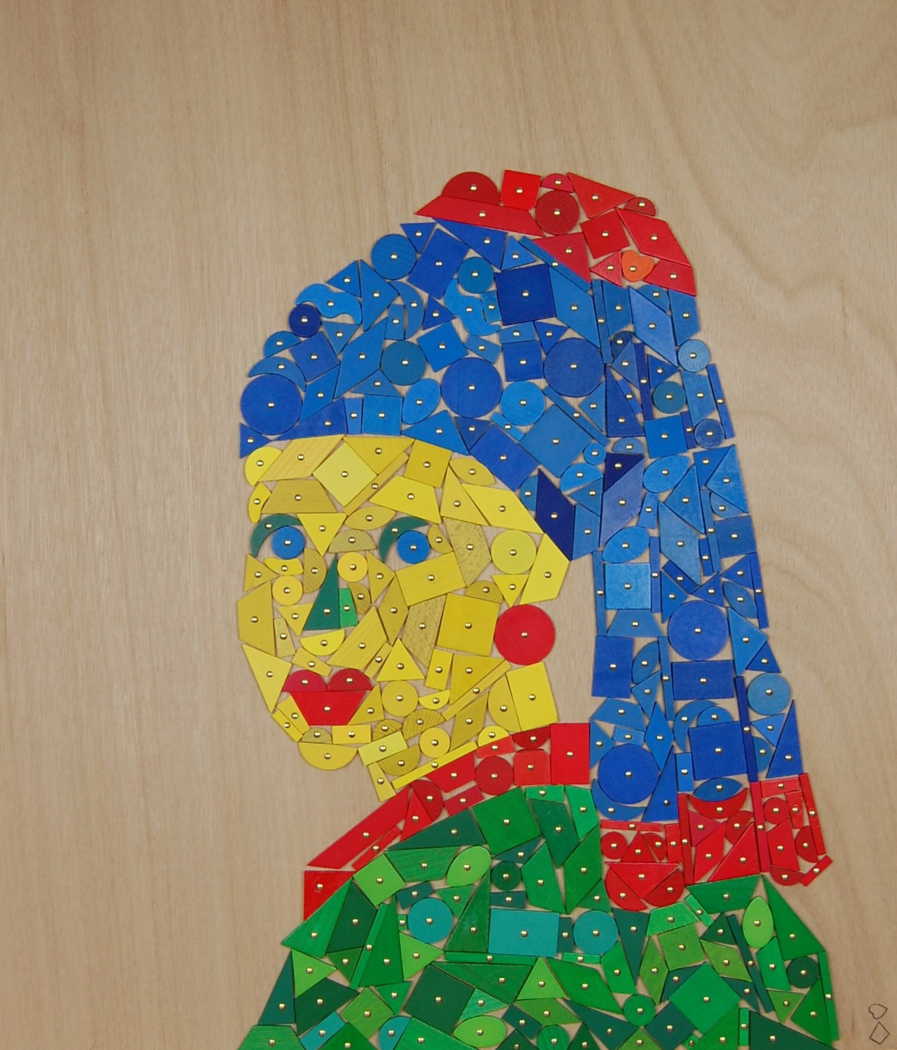 Gemaakt van originele houten stukjes van het bekende spelletje hamertje tik is hier op een abstracte manier het meisje met de parel vertaald.