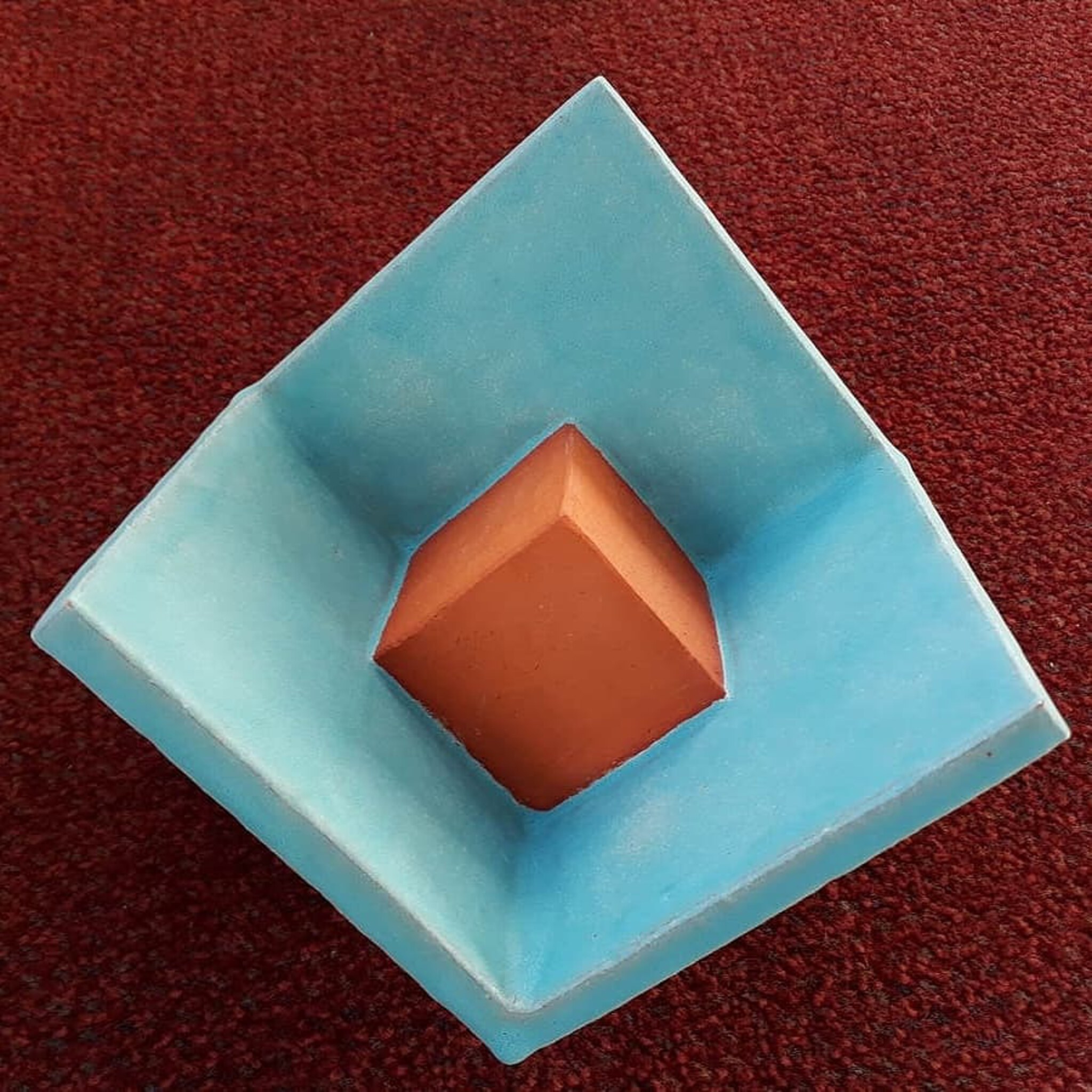 Een halve kubus met daarin een kleine kubus. Onderdeel van een serie van drie. De anderen zijn met een bol en een driehoekvorm.