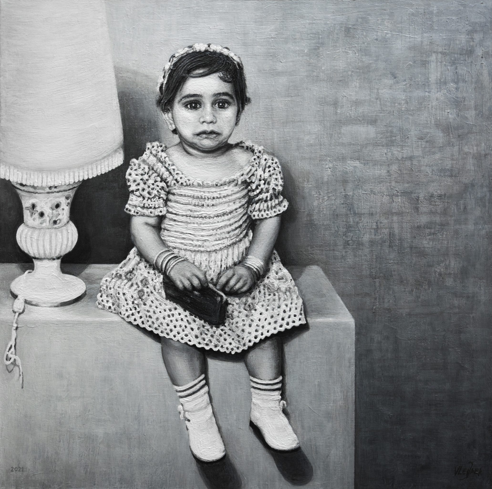 Na een bijna vernietigde familiefoto uit het puin van de oorlog in het Midden-Oosten heeft de vader van het meisje deze foto weten te redden vervolgens heb ik geprobeerd de foto opnieuw te construeren en te schilderen.....