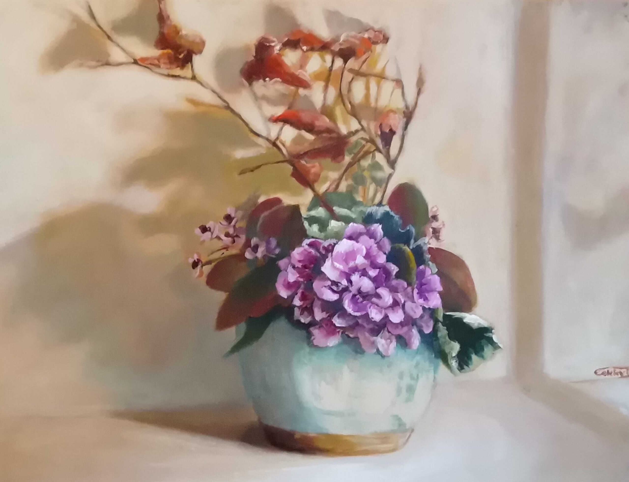 Figuratief Realistisch Olieverf Doek Oud Herfst Hortensia Schaduw Vaasje Besjes Bloemstuk Klimop Herfsthooi