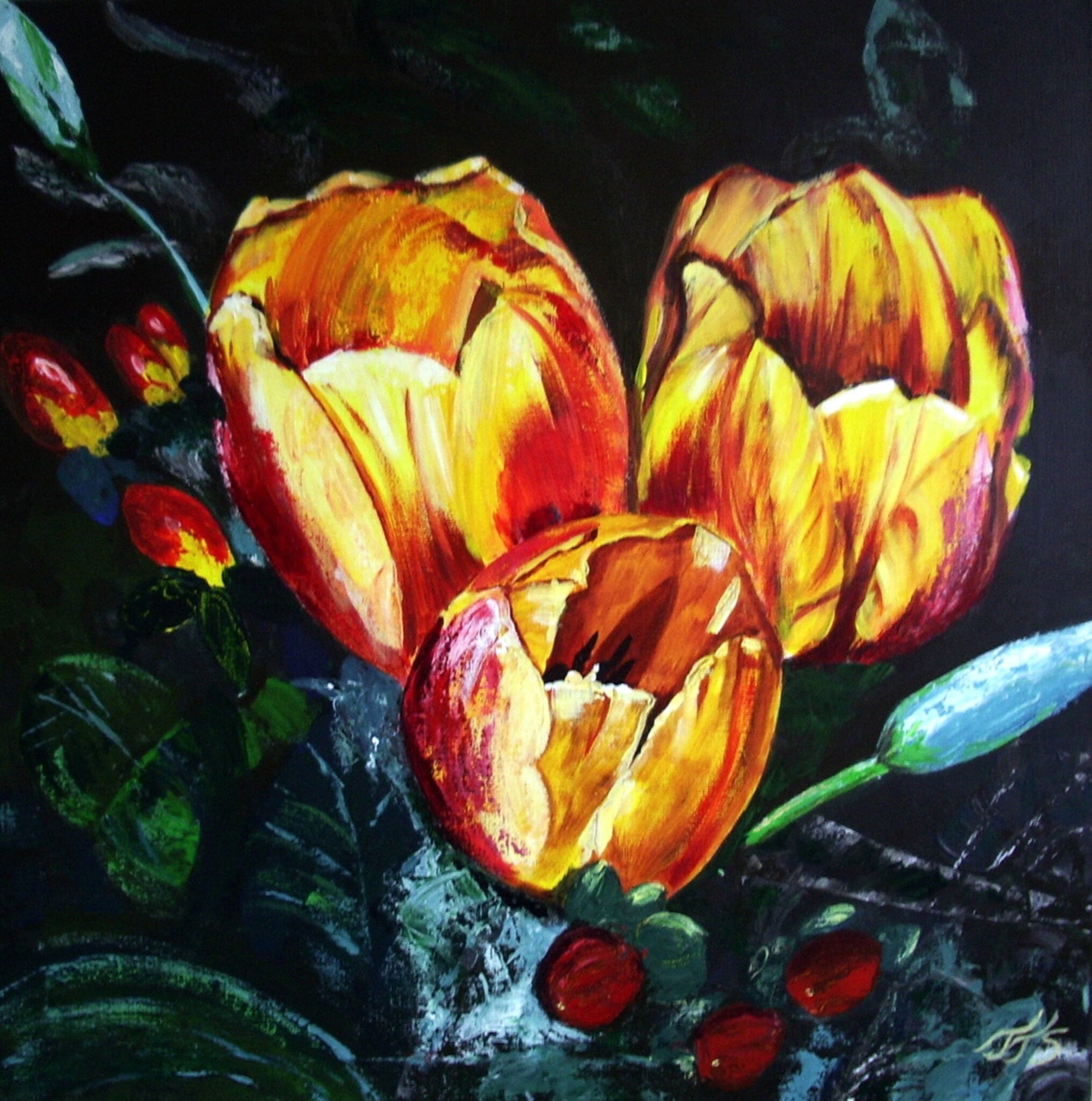 Een vrolijk schilderij met geel rode Tulpen, het voorjaar komt eraan.