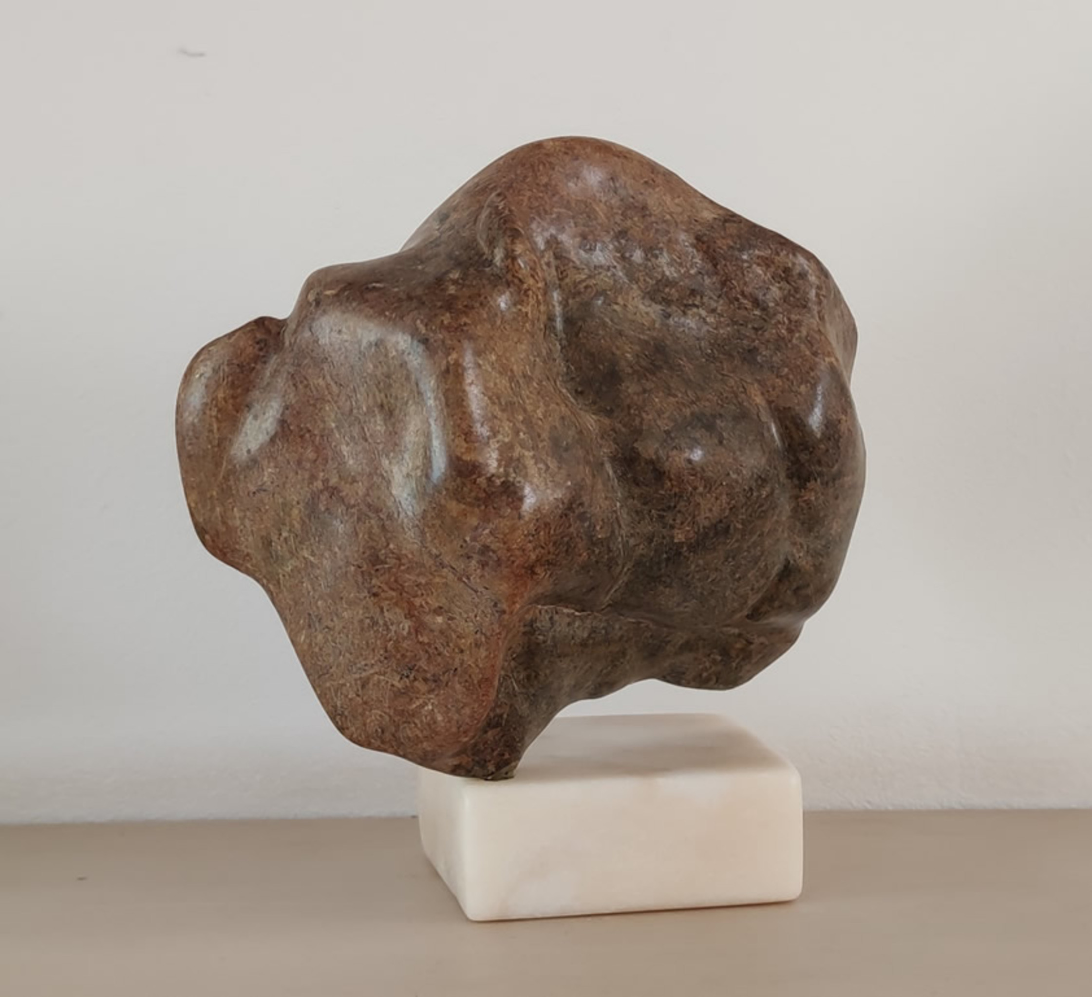 Bizon op voet Materiaal: Bruine Serpentijnsteen Spotted Opal, Zimbabwe op roze Portugees marmer - Gewicht: 3,5 kg Gemaakt in: Eerbeek, 1999, voetstuk 2021 Wenum Opmerking: Dit beeld is intuitief gemaakt naar de vorm van de steen - organisch. Het beeld zat er al in en ik heb het eruit gehaald. De Bizon is gemaakt van een bruine serpentijn steen genaamd Spotted Opal. De bizon zelf is gepolijst en de voet is van roze Portugees marmer. Buffalo on a foot Material: Brown Serpentinestone Spotted Opal, Zimbabwe on pink Portugese marble - weight: 3,5 kg Made in: Eerbeek, 1999, voetstuk 2021 Wenum Notice: This sculpture is made intuitively according to the shape of the stone - organic. The sculpture was already there and I took it out. The base is made of a brown serpentine stone named Spotted Opal. The bison itself is polished and the foot is from a pink Portugese marble.