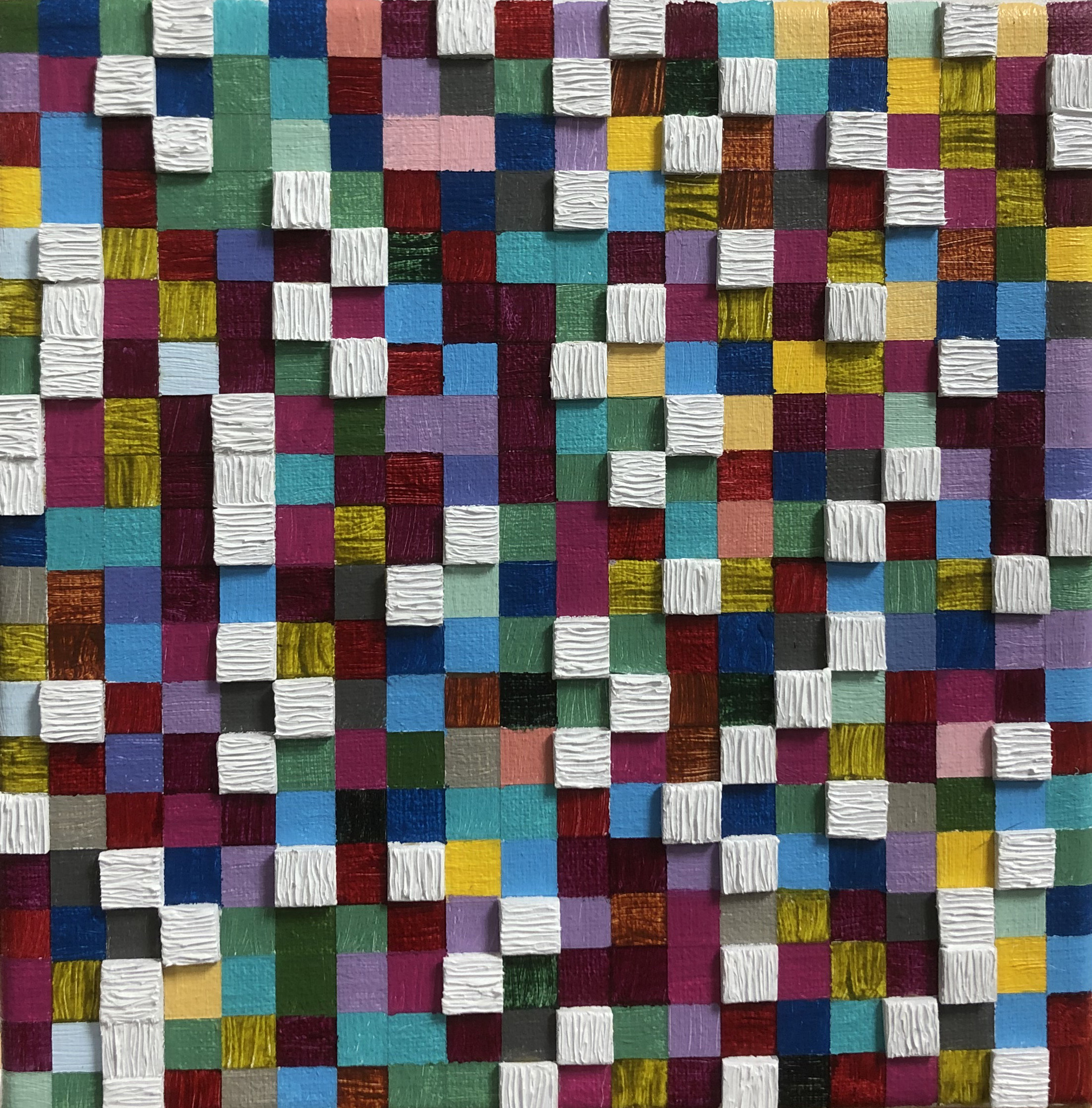 Thema: Chaos (Geometrische Chaos) Mijn kunst is beïnvloedt door de moderne wiskundige en wetenschappelijke benadering van het begrip complexe orde van de natuur. Met name heb ik me verdiept in de Chaos theorie en de fractal geometrie. Ik ben geen wiskundige, en ik gebruik geen wiskundige formules. De ideeën van de Chaos theorie en fractal geometrie leiden tot de ontwikkeling van de composities in mijn werk. Ik gebruik driehoeken,vierkanten en cirkels in mijn schilderijen, maar in mijn huidige serie, geoChao richt ik me alleen op de vierkanten en de verhoudingen tussen de vierkanten. Ik ontwikkel mijn composities door kleine vierkantjes op grote te zetten of grote op kleine te zetten. Het gaat om de onderlinge verhoudingen tussen de vierkanten. Ik laat de methode die ik kies de compositi