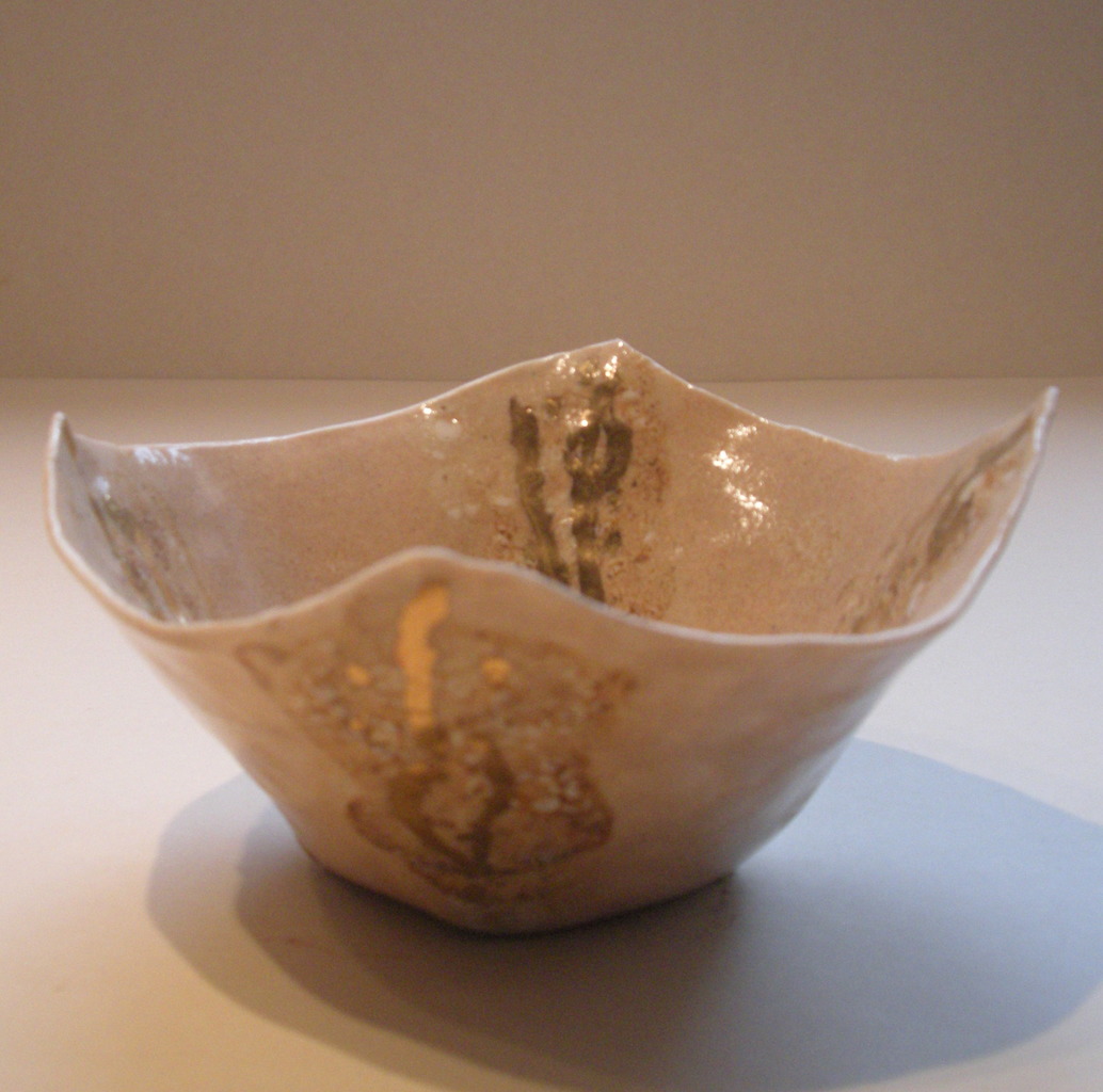 schaaltje van porselein, verschillende glazuren over elkaar heen gezet in crème en wit met goudluster