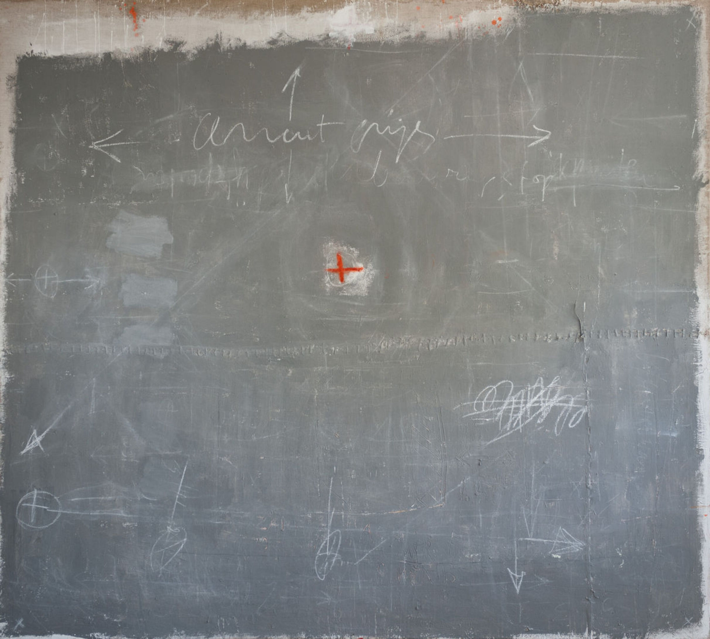 Cementgrijs is gemaakt tijdens de verbouwing van onze toenmalige boerderij ; ik was in de ban van cement, stucwerk, betonmolens en al die dingen. Op het doek zit, naast pigmenten, ook daadwerkelijk cement verwerkt, en het markeerpunt in het midden is natuurlijk van menie ! Het doek is een afspiegeling van de werkelijkheid waarin ik me toen bevond.
