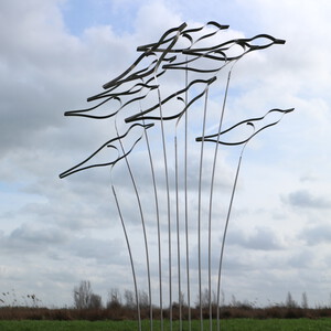 Gemaakt van RVS draad en aluminiumgaas. Los geplaatst op betonijzer mbv een koperbusje. De sculptuur bestaat uit 3 onderdelen die in hoogte verschillen. Diverse opstellingen zijn mogelijk. Bijzonder geschikt voor elke tuin.