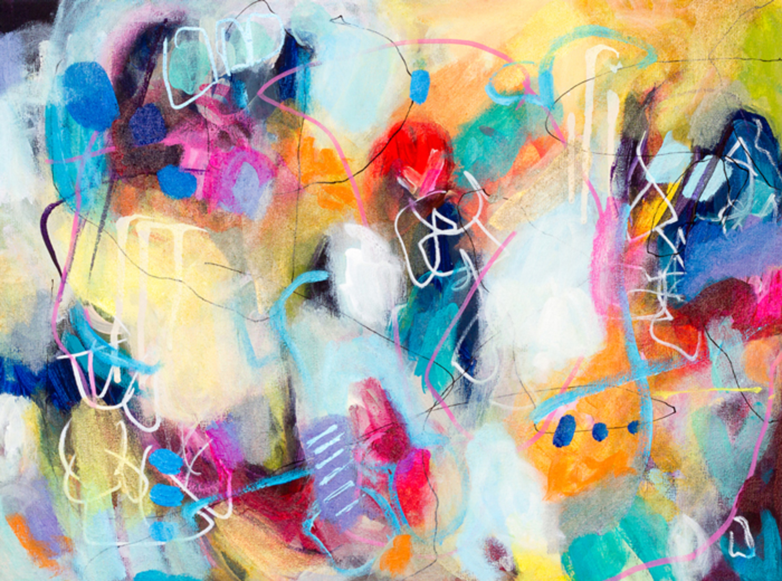 Funked Up hoort helemaal in het rijtje kleurrijke abstracte werken van Qeimoy. Met een pittig kleurenpalet krijgt het een edgy, funky look. Grotere vlakken worden met grillige spontane lijnen afgewisseld. Laat zien dat je voor kleur durft te gaan in je interieur! (Origineel werk is verkocht. Voor prints, zie qeimoy.com)