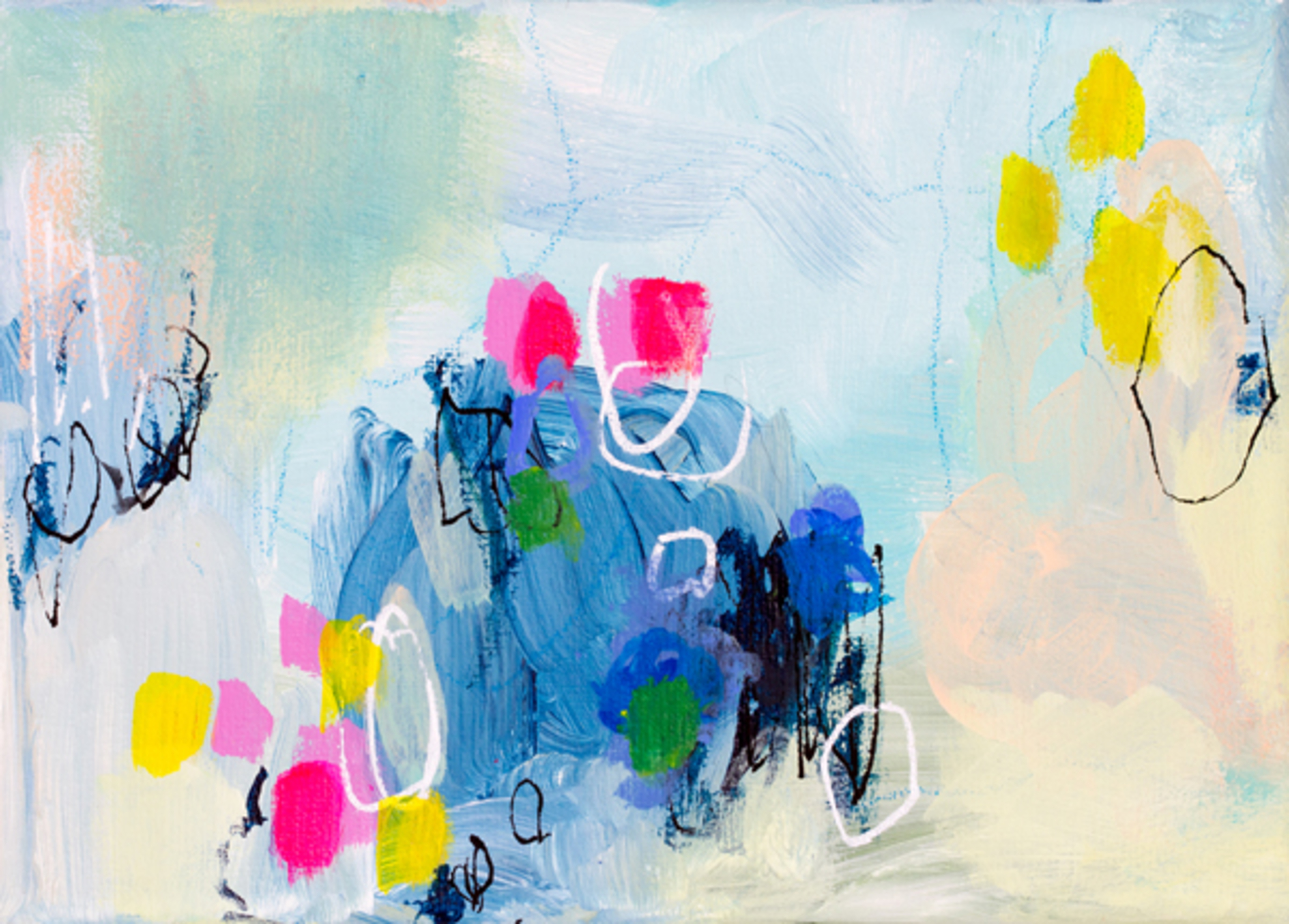 Zonnig en licht abstract schilderij. Fijne zachte pastels met een compositie van kleurrijke accenten en grillige lijnen. Als een zomers dagje uit. Goed te combineren met Luscious Lagoon, ook van Qeimoy. (Origineel werk is verkocht. Voor prints, zie qeimoy.com)