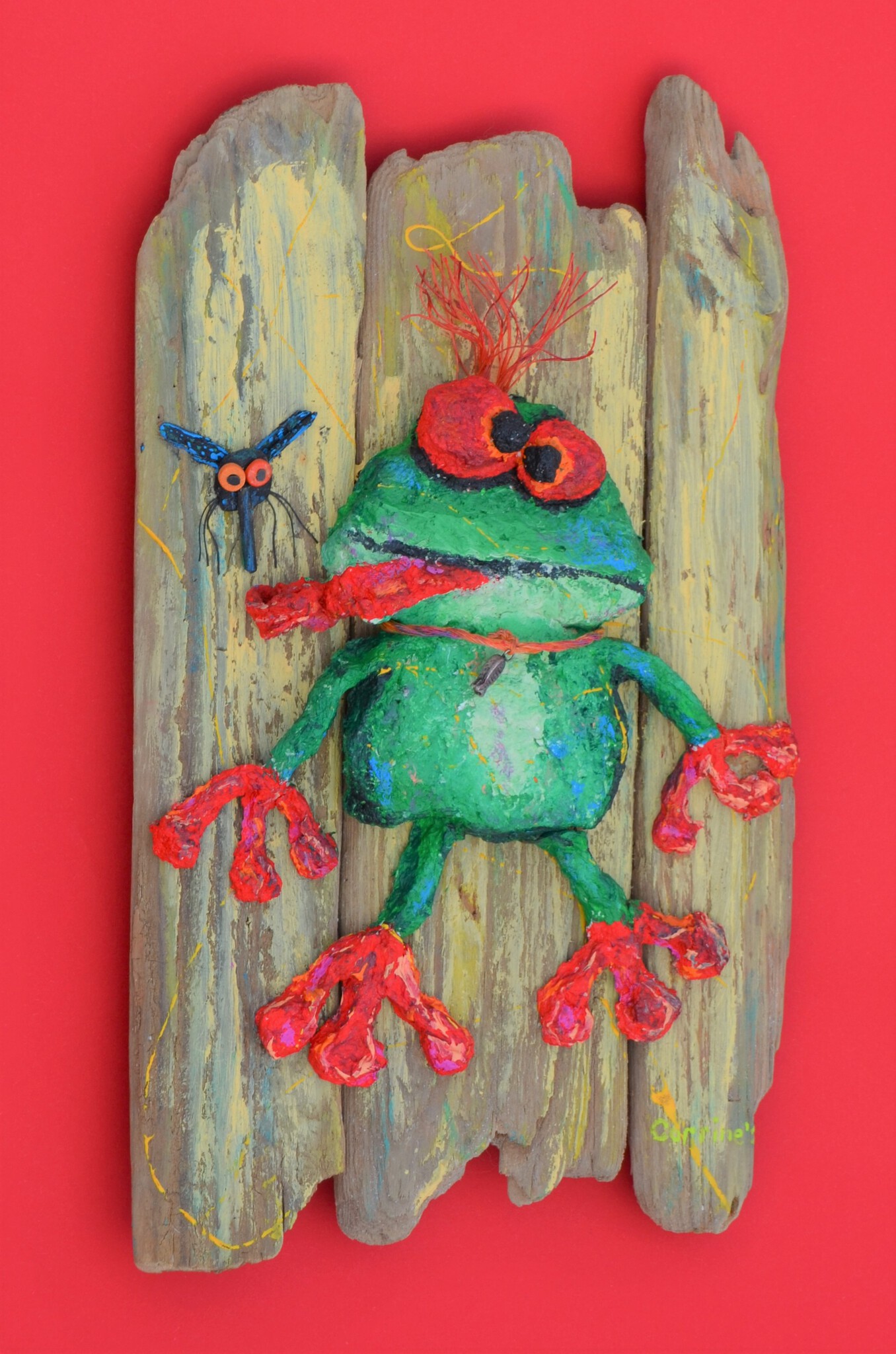 Kikker vangt vlieg deze grappige kikker is bevestigd op een drijfhouten paneel. Net bezig met het vangen van een vlieg. Leuk detail: Hij heeft een kettinkje om van visserstouw met een zilverkleurige vis eraan.