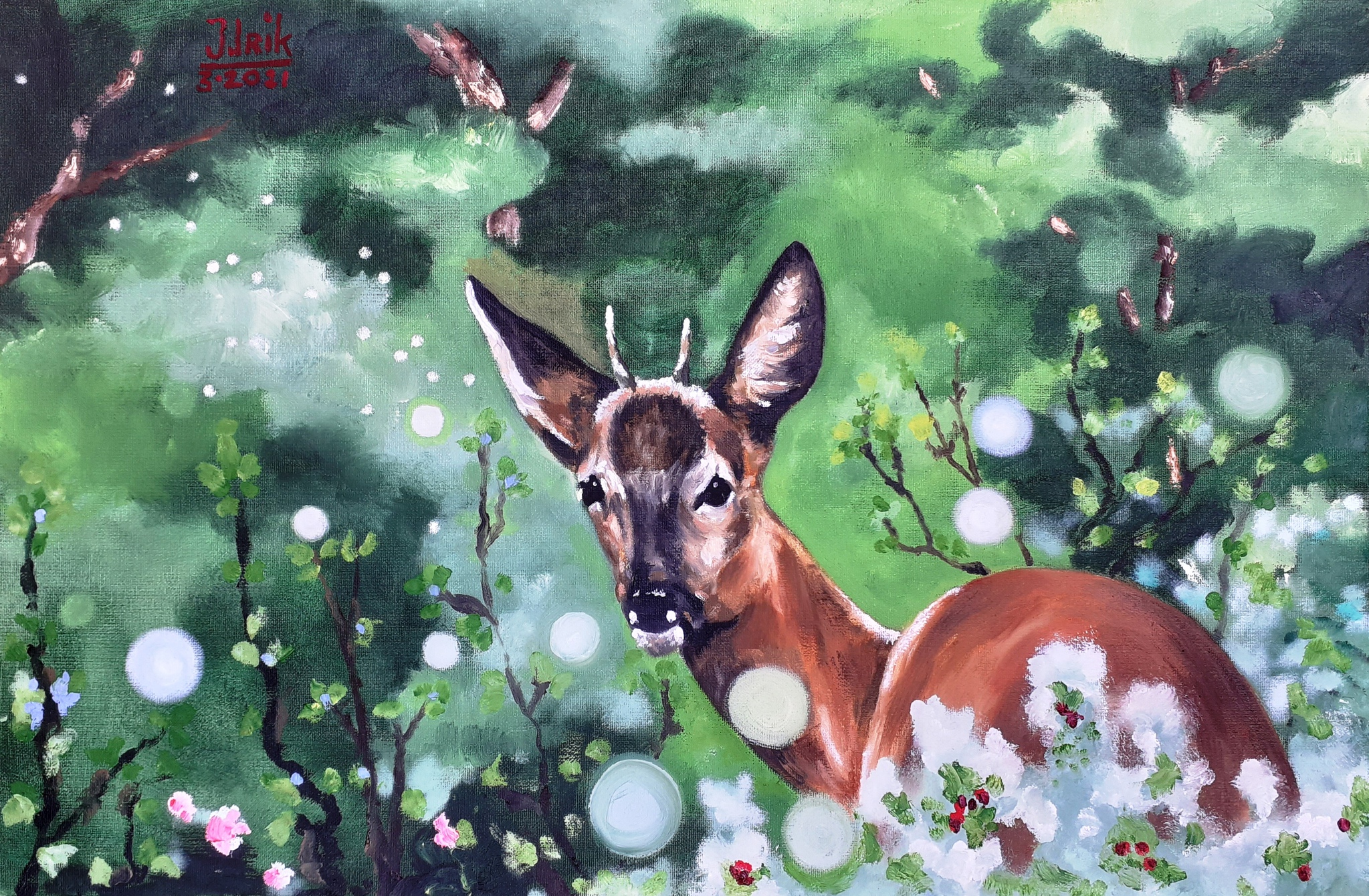 Ik werk graag met olieverf op doek of paneel. Mijn werk heeft vaak dieren en de natuur als onderwerp. Maar soms kies ik ervoor om een droom of gemoedstoestand weer te geven.