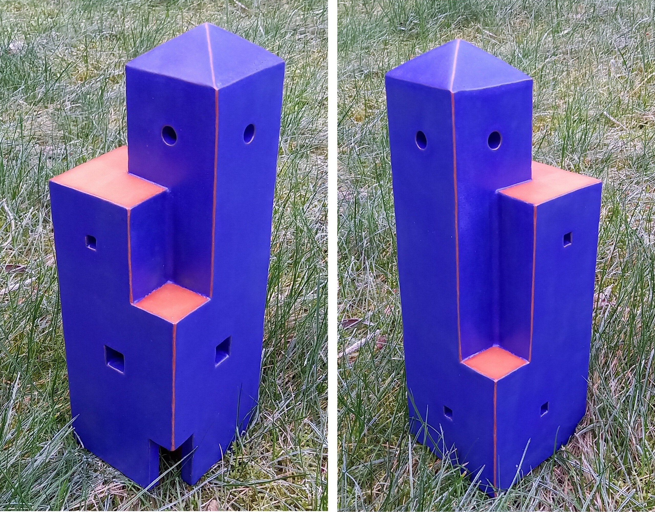Torengebouw met overhoekse massa-uitwerking in 4 niveau's. Rode klei en blauw glazuur. Platte daken en hoeken vrij van glazuur