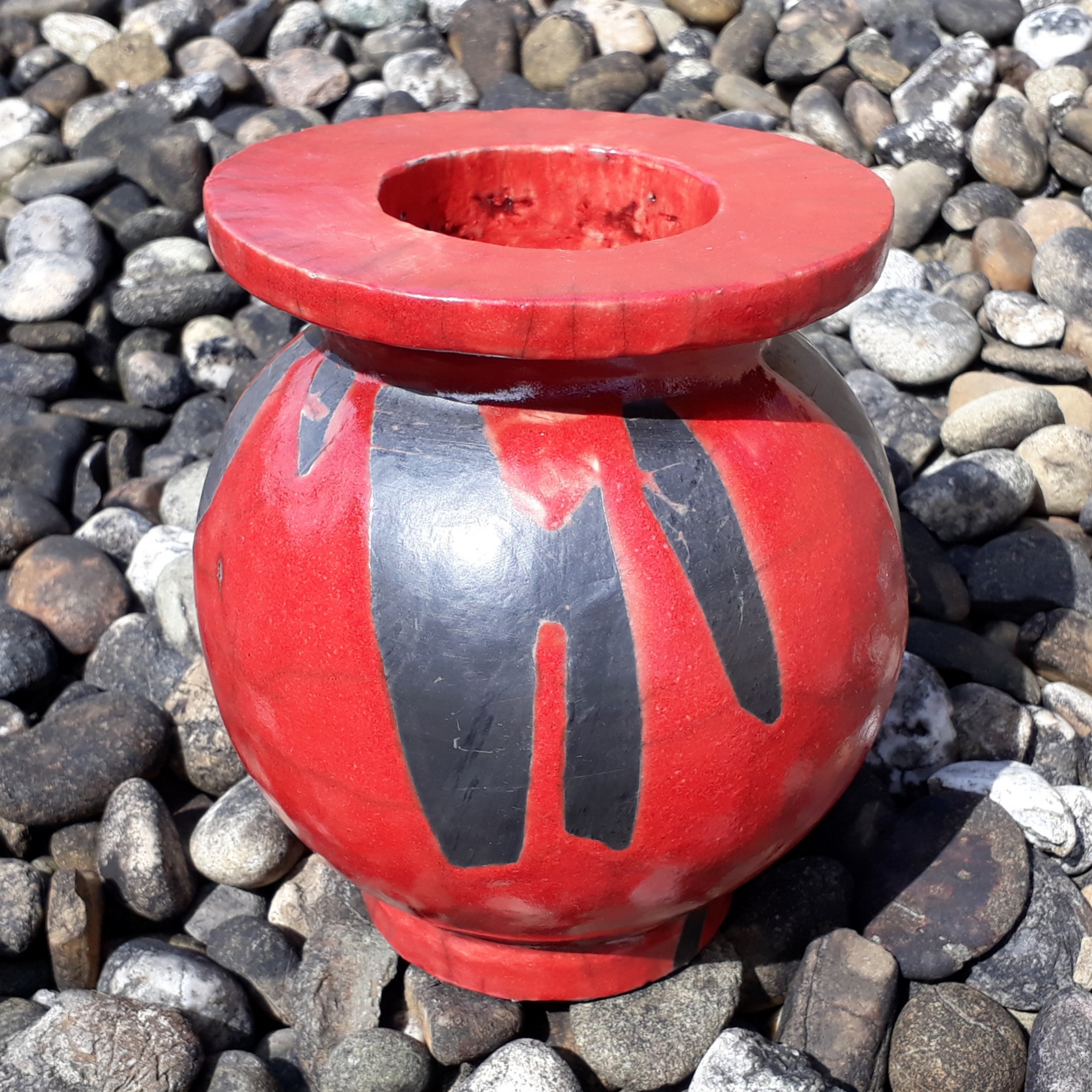 Bolvaasje met horizontale schijf. Witte klei met rode glazuur overgoten.