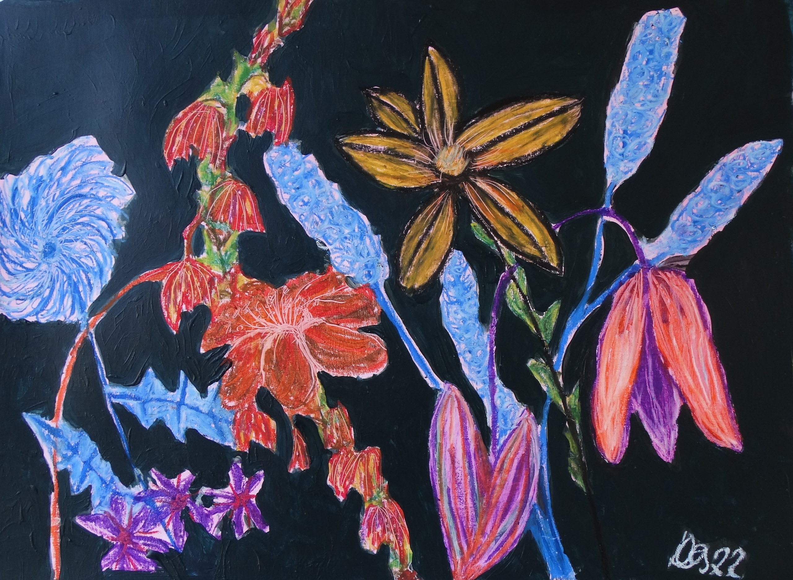 Dit werk is op speciaal (dik) schilderpapier gemaakt Acrylverf en oliekrijt samen in een schilderij. Mooie combinatie voor deze bloemen in de nacht.