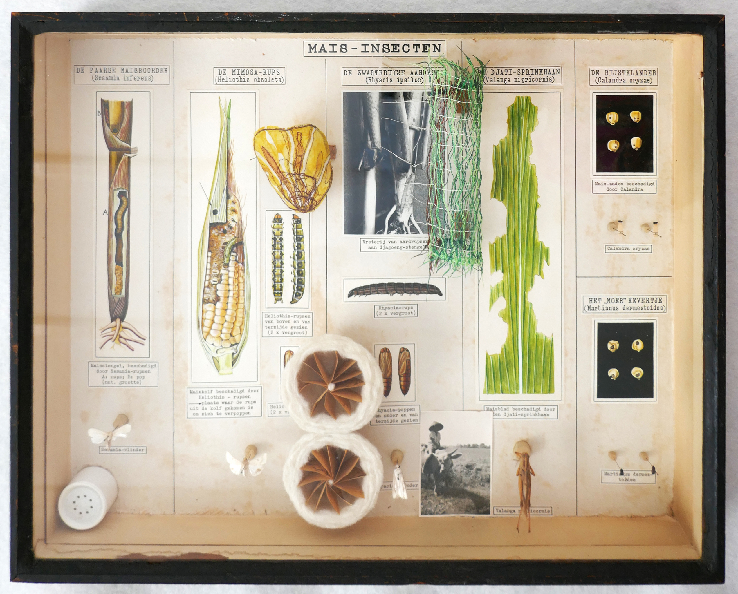 Mais, orginele insectendozen, wol, zijde, naaigaren. Foto met deksel gesloten.