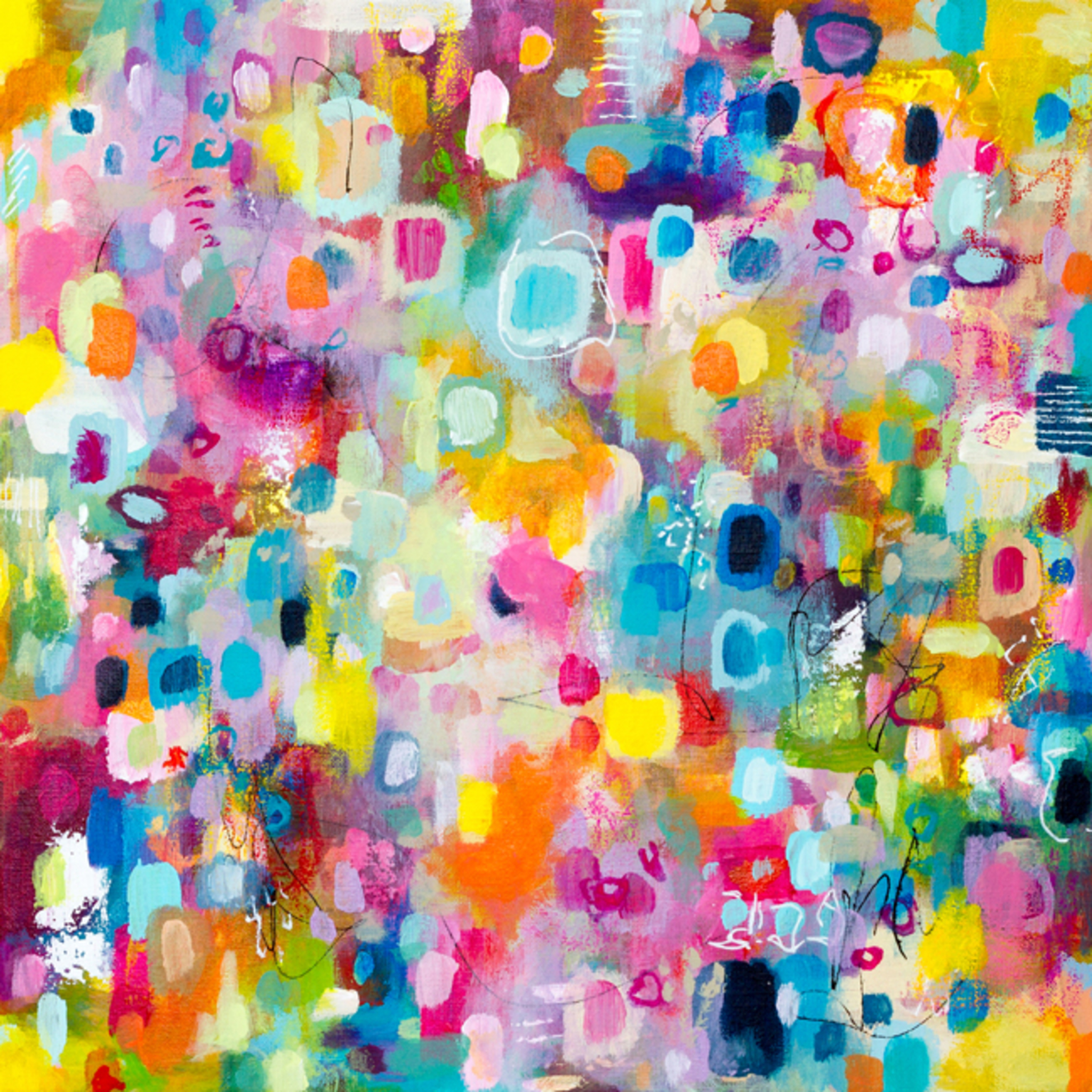 De schilderijenserie 'Color Shots' is een explosie van kleuren. Als een koraalrif, een overdadig bloeiende tuin, of al wat jij erbij voelt. Een stukje geluk in je woning. Om in je op te nemen en de vrolijkheid te absorberen. 40*40cm, 21-25mm dikte Acrylverf op 100% linnen, gespannen op een houten frame. Origineel schilderij. Wordt geleverd zonder lijst. Je kunt de oriëntatie van dit schilderij zelf kiezen (staand/liggend). De zijkanten van het doek zijn in een neutrale lichte tint geschilderd. Wanneer je dit werk wilt inlijsten, kies je bijvoorbeeld voor een baklijst.