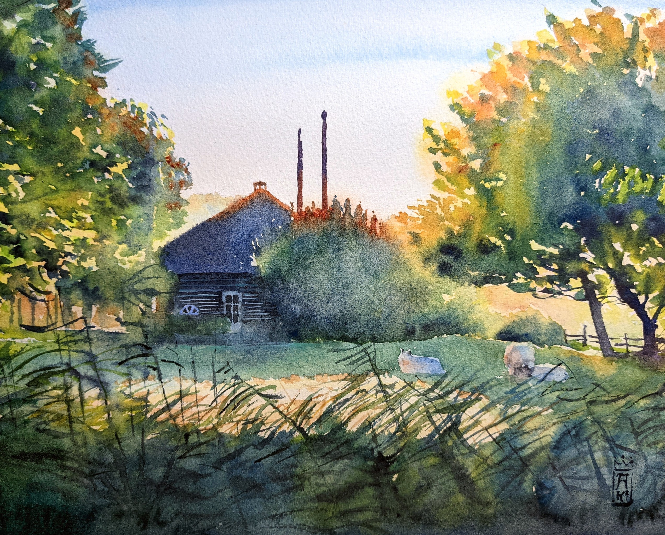 Zon Aquarel Realistisch Natuur Watercolor Schapen Boerderij Farm Realistic Sunrise