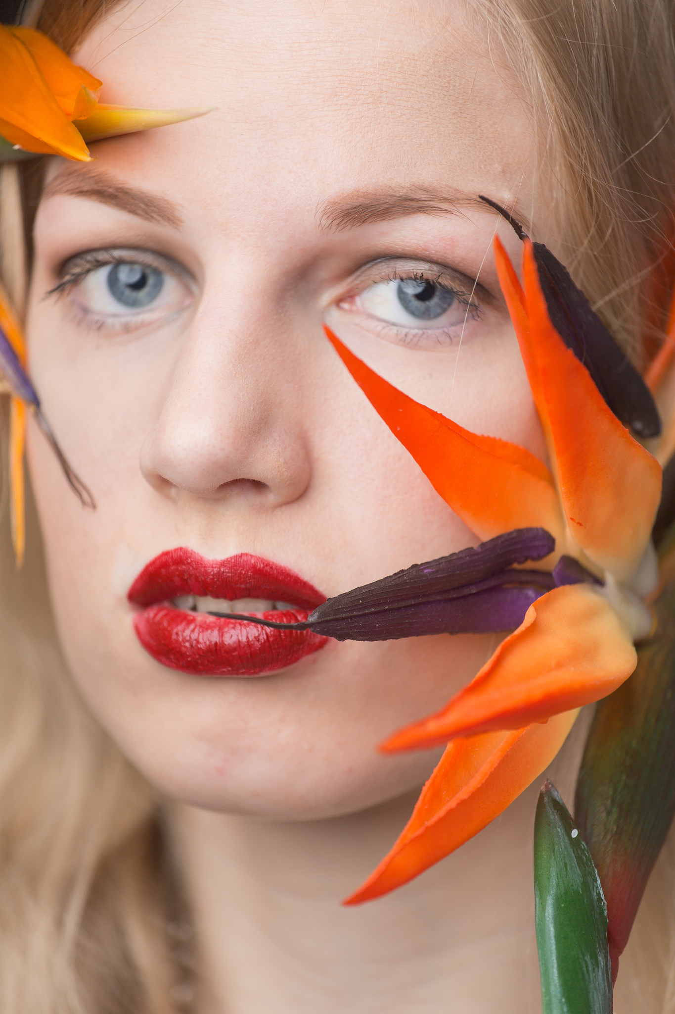 Meisje met papegaai bloemen.tijdens de fotoshoot Flower power.