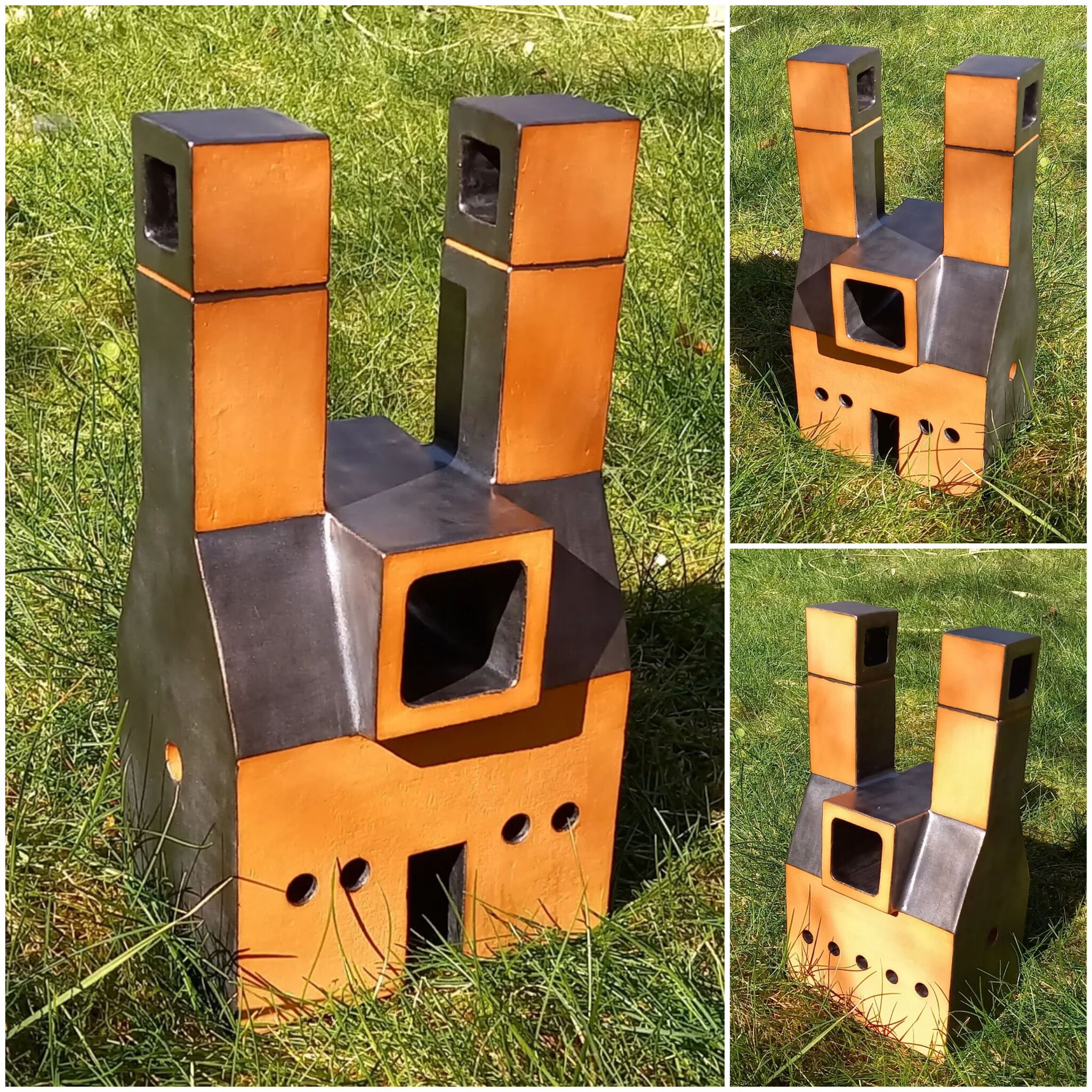 Tweelingcentrale, geïnspireerd op de tekeningen van architect Antonio Sant'Elia. In rode klei en een brons glazuur.