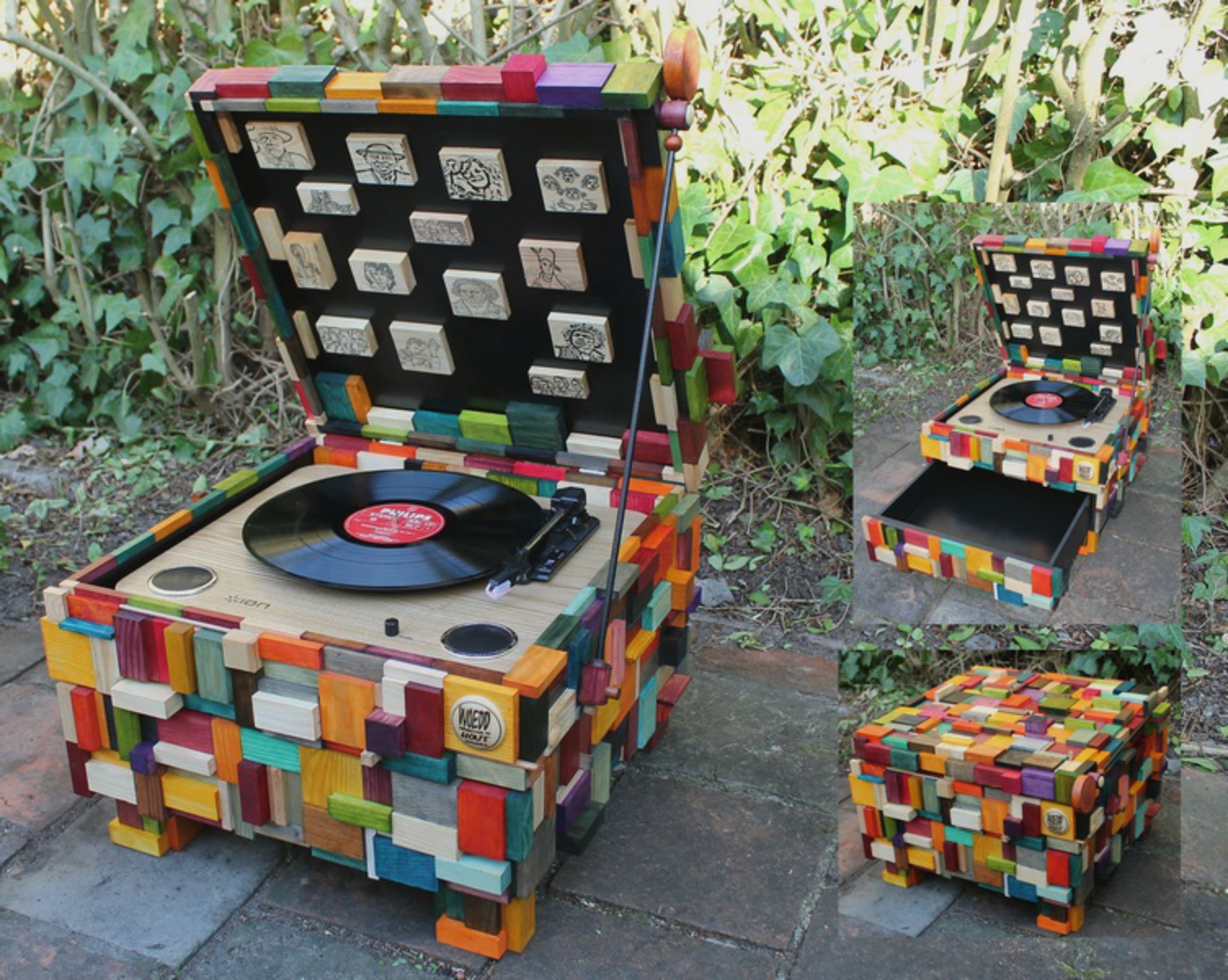 Pickupkast met afbeeldingen van diverse componisten in klep en lade voor het opbergen van platen.