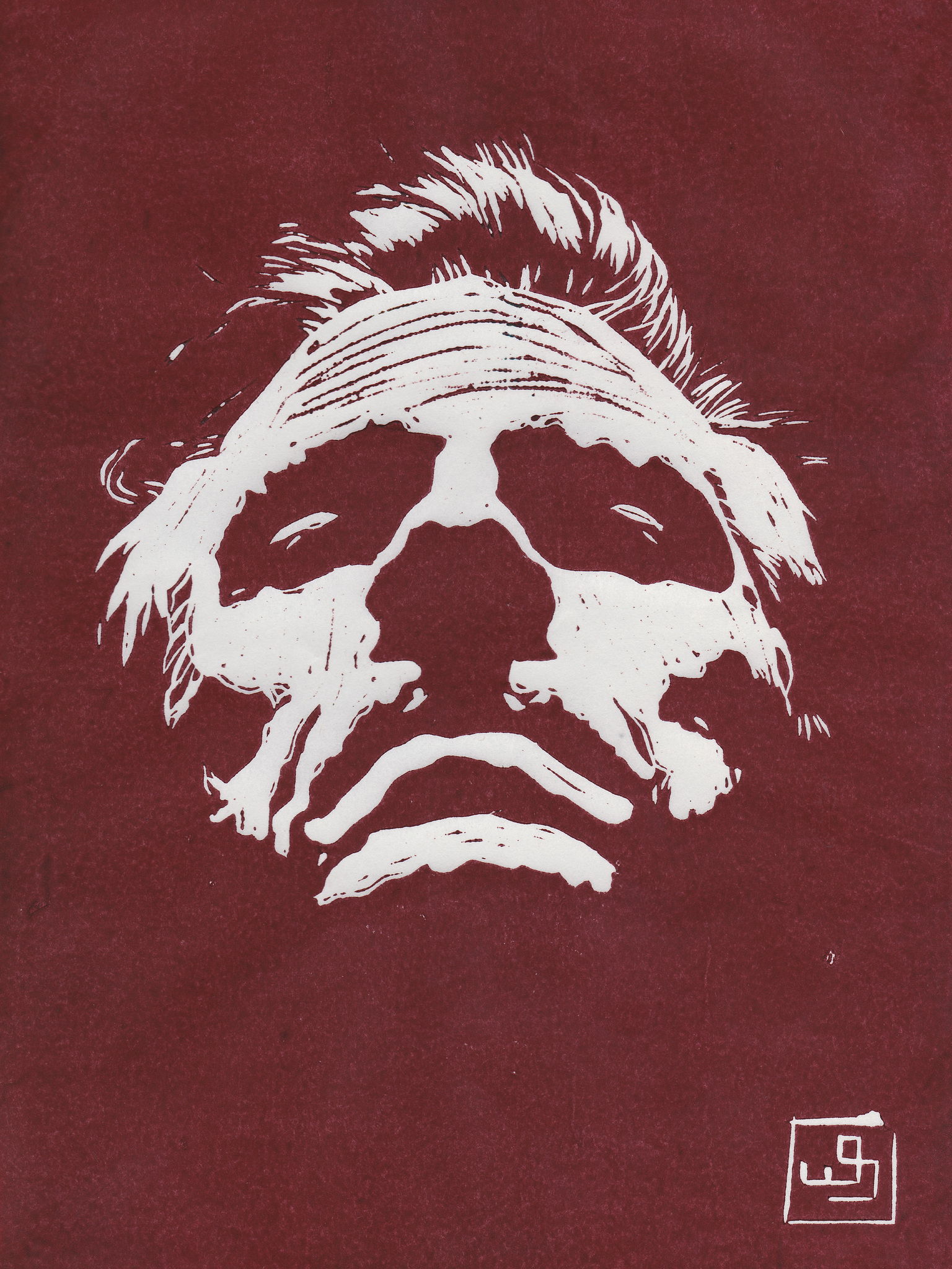 Zelfportret in lino snede gedrukt in inkt op rijstpapier. Afbeelding 30 x 20 cm Papier 37 x 26 cm Kan op aanvraag op ander papier worden gedrukt en eventueel in andere kleur.