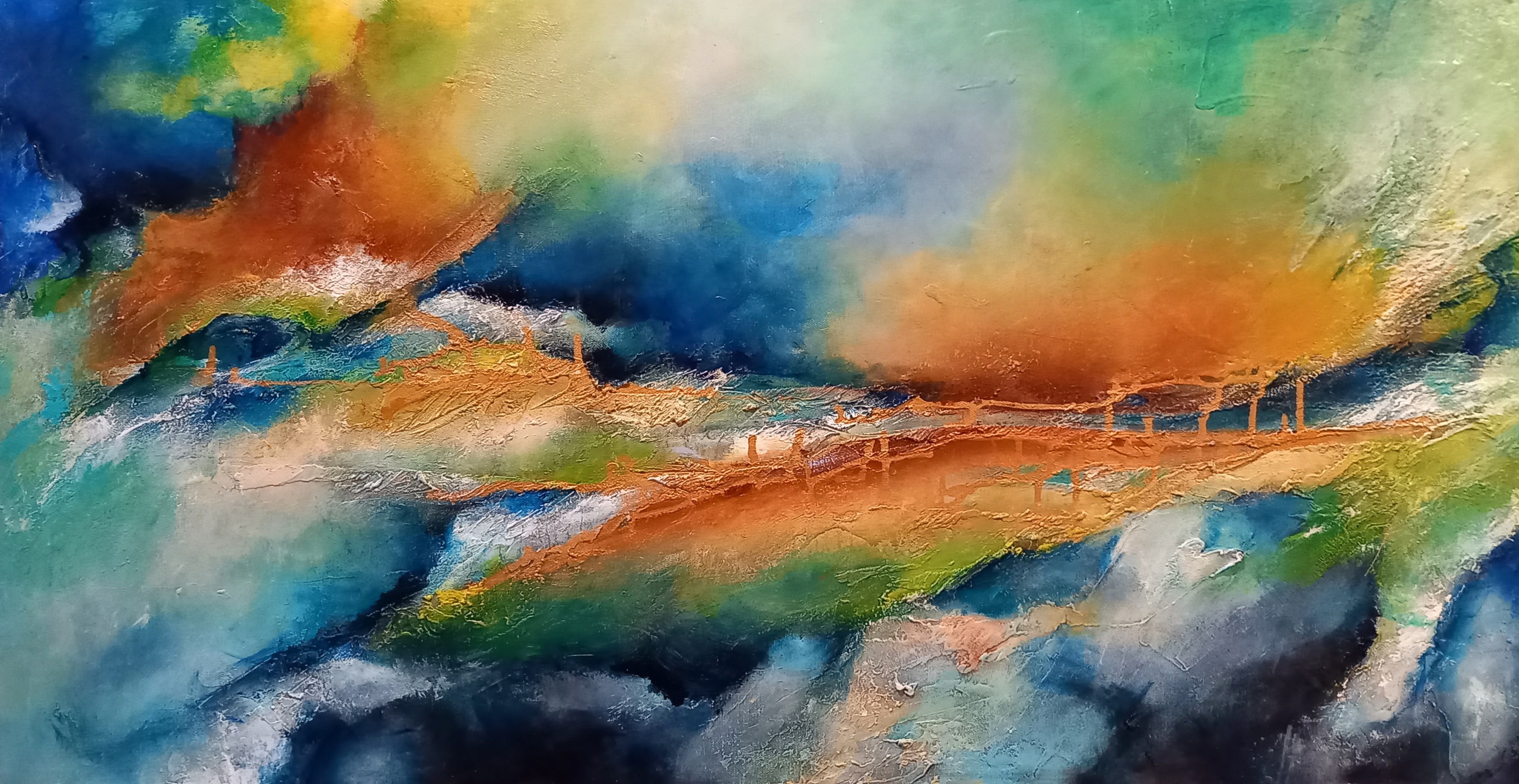 60 x 120 x 4 cm (3D) Acrylverf op linnen. Een abstract schilderij met uitgesproken krachtige kleuren.