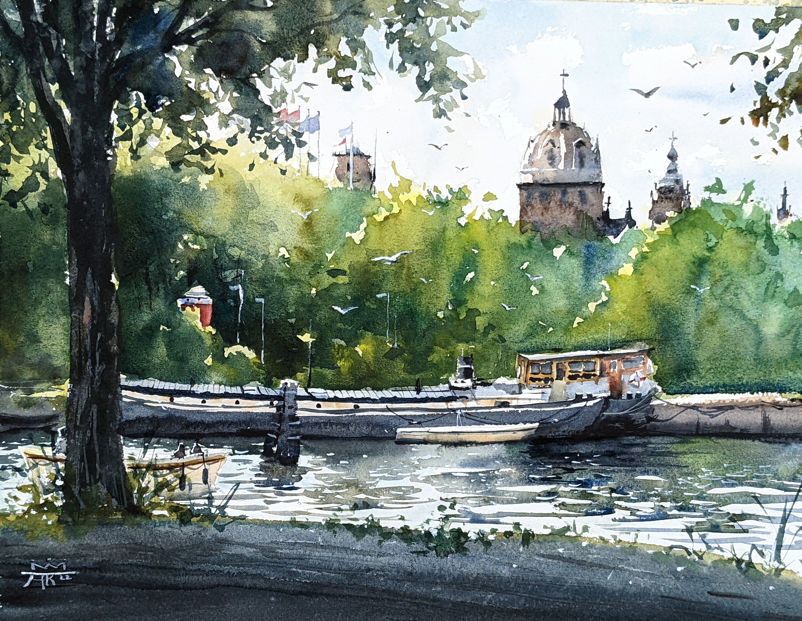 Amsterdam Haven Oosterdok Kerk Schepen Bootjes Water Aquarel Watercolor Impressionistisch Realistisch Boats Ship