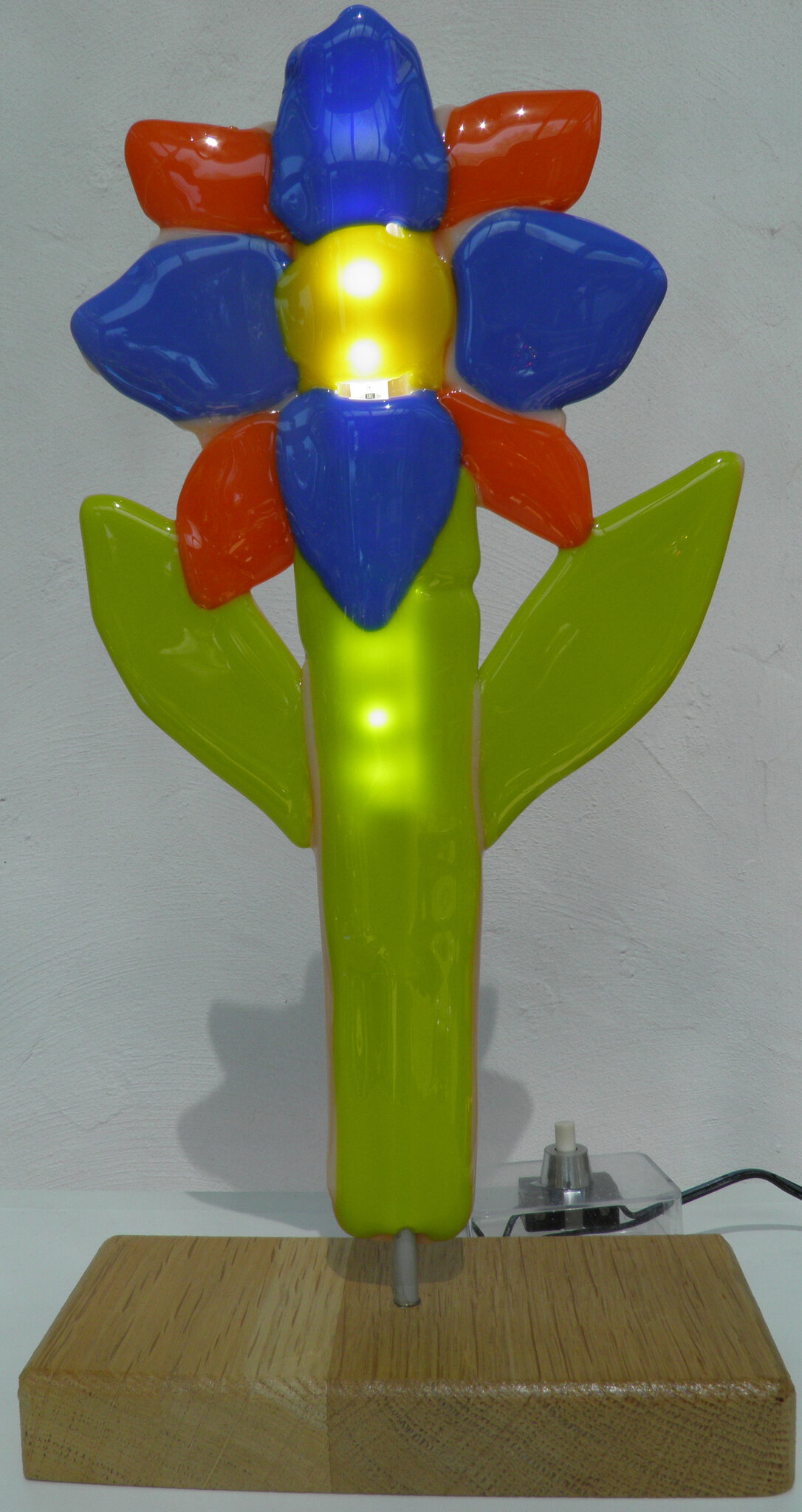 Tussen het glas van bloem en bloemsteel is ruimte gelaten voor een buisje en een ledstrip. De ledstrip krijgt stroom van een adaptor uit de kringloopwinkel. Zo wordt die ook weer hergebruikt.