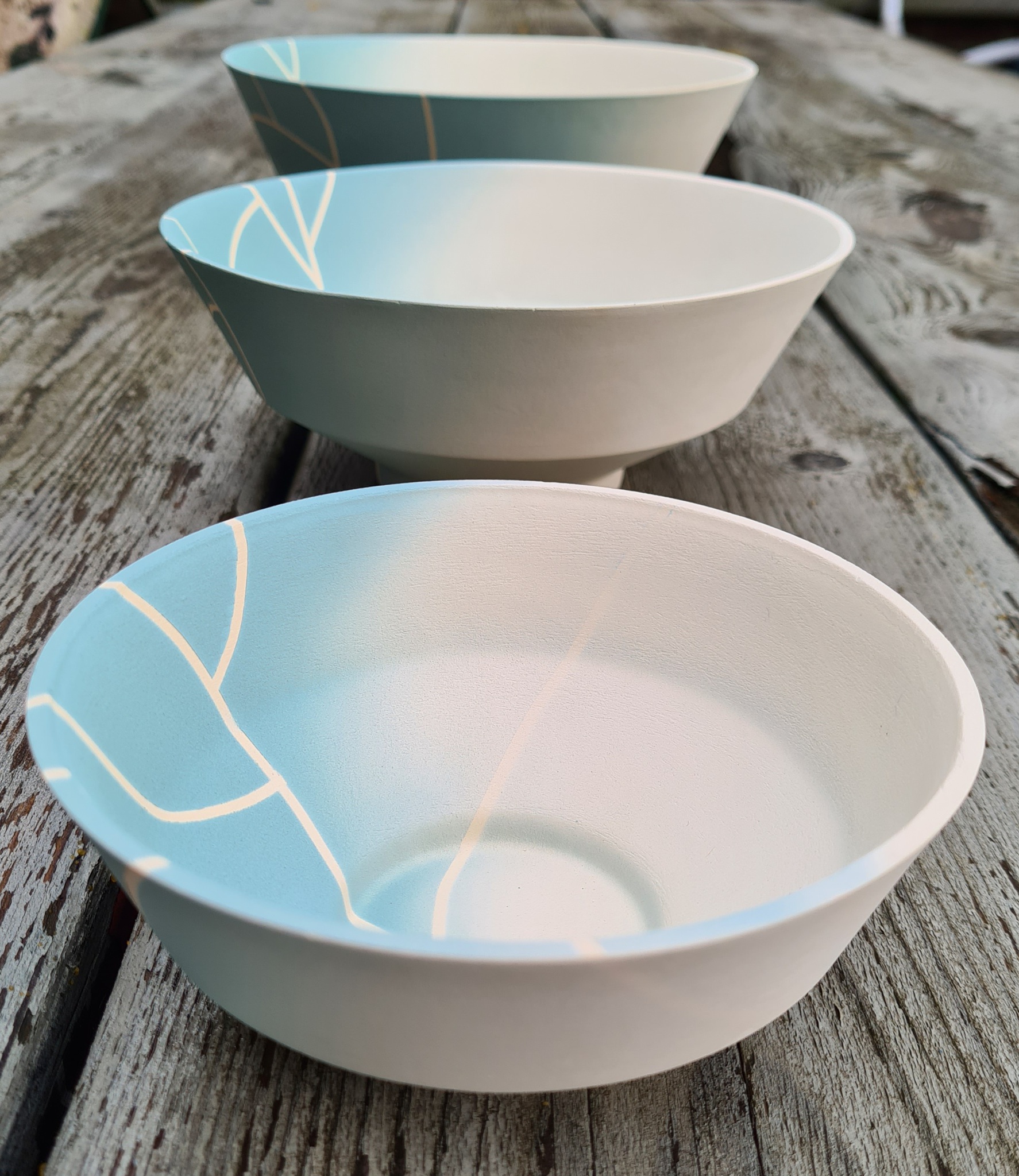 Serie van 3 schalen van groot naar klein. Schaal is gegoten in een gietmal van gips. De moedervorm van de gietmal is gedraaid op de gipsdraaibank. De kleur is aangebracht met de airbrush.