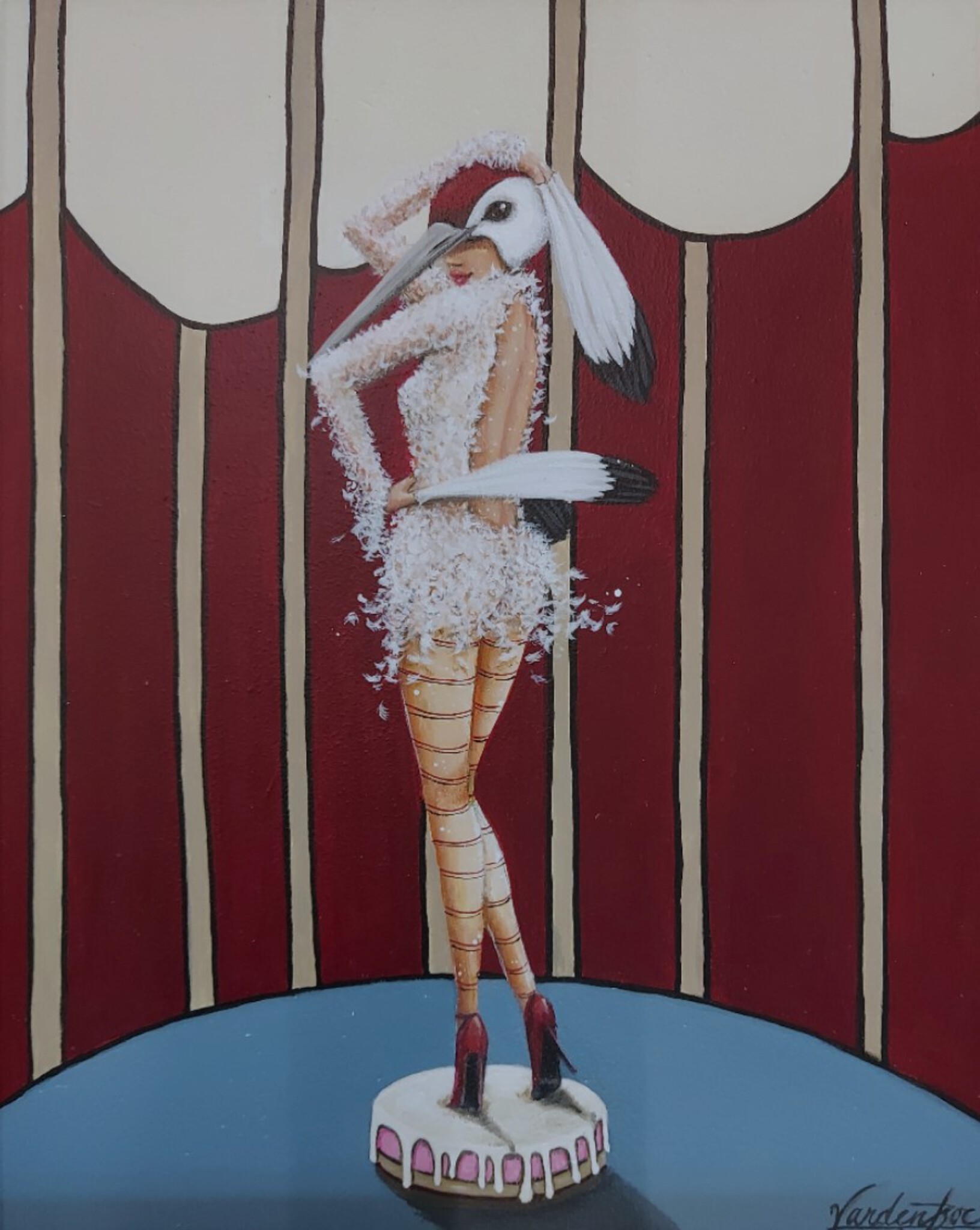 Judy Licious is een 'teaser', deze Little Treasures zijn gebaseerd op het lied 'Patricia the Stripper' van Chris de Burgh. Deze dames hebben de verschijning van een kraanvogel en zijn afgebeeld tegen een theater decor, met een knipoog naar zoetigheid en de jaren '20. afm. 30 x 24 cm. Verkrijgbaar bij Friends of Art Gallery in Giessenburg Alle Little Treasures zijn geschilderd op paneel en zijn ingelijst in een handgeschilderde houten baklijst die qua kleur afgestemd is op het schilderij.