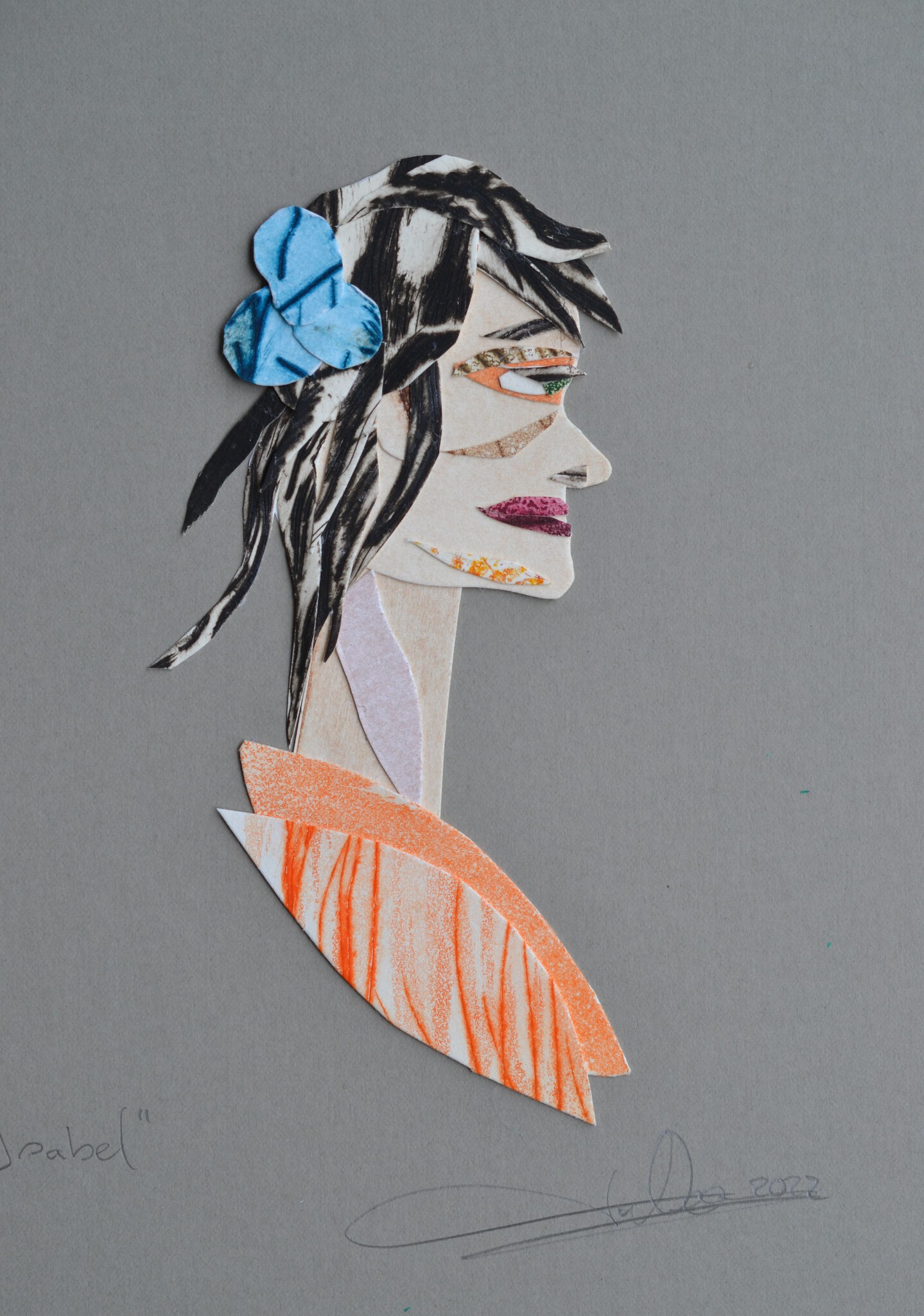 Isabel - collage van verknipte drukken van mijn vroegere etsen - collage réalisé avec mes anciens gravures découpées - collage made from my earlier prints - edition 1/1 - in passepartout 30 x 20 cm.