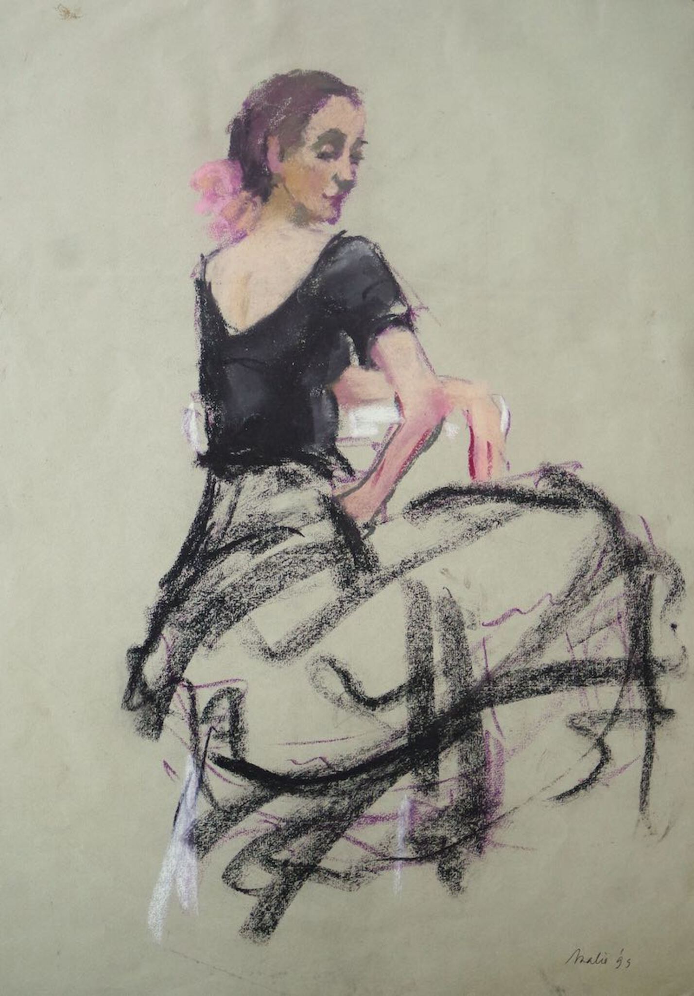 Maria heeft vaak voor mij geposeerd, vooral in het atelier van Anton Assies. Deze pastel zit in een zwarte lijst met passepartout. De buitenmaat is 50x70 cm.
