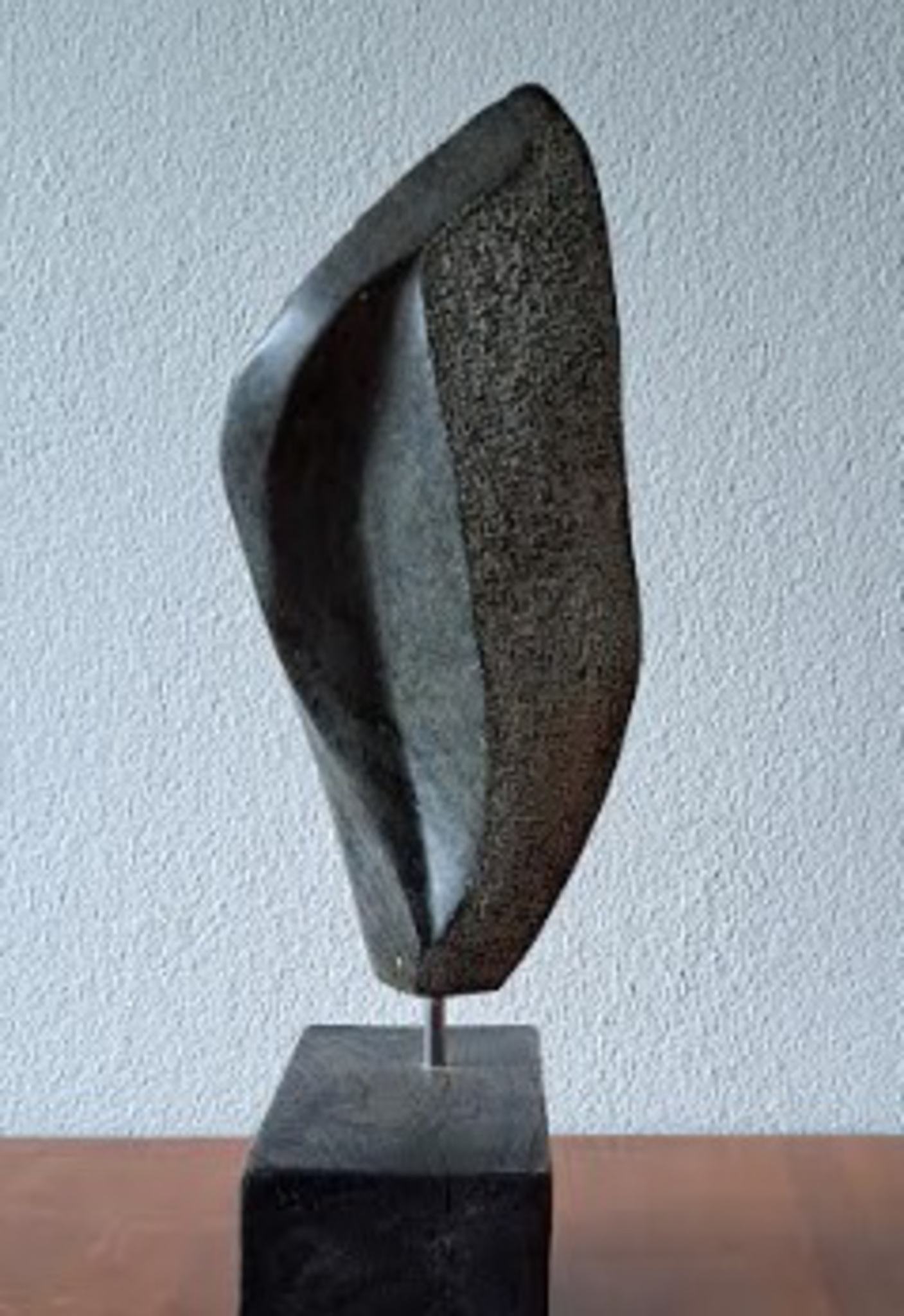 (klik op de afbeelding om het werk groter te bekijken) 'Vlam': met veel aandacht en liefde heb ik in de zomer van '21 in (een zeer warm) Zuid-Frankrijk dit donkergekleurde serpentijnen beeld gemaakt. Deels glad gemaakt en gelaten, deels na het glad maken weer gebouchardeerd. Dit beeld weerstaat alle weersinvloeden, kan dus buiten geplaatst worden.