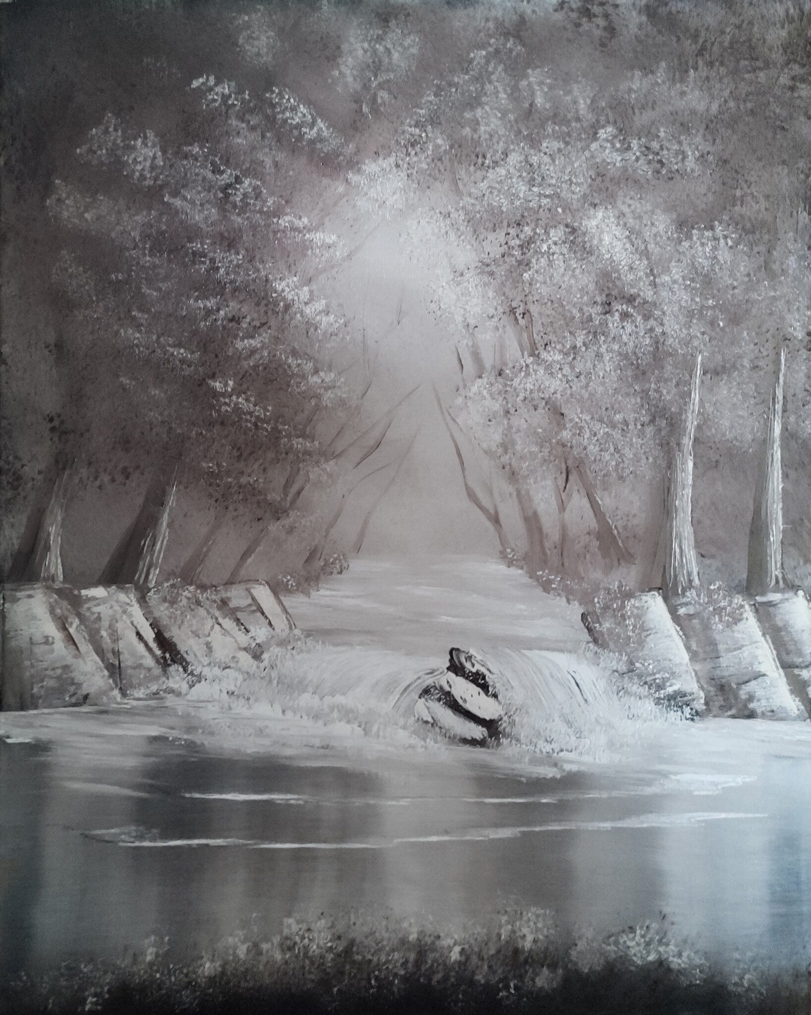 Dit is mijn allereerste officiële schilderij die ik gemaakt heb. Het is een rivier, omgeven door bomen, geschilderd in sepia kleuren met olieverf. Wat was ik trots op dit schilderij. Het smaakte naar meer en je raakt nooit uitgeleerd. Hoe vaker je schildert, des te beter krijg je het onder de knie. Compositie, diepte, het gebruik van diverse soorten penselen, de juiste kleuren mengen, etc. Je moet op veel dingen letten om tot een goed schilderij te komen.