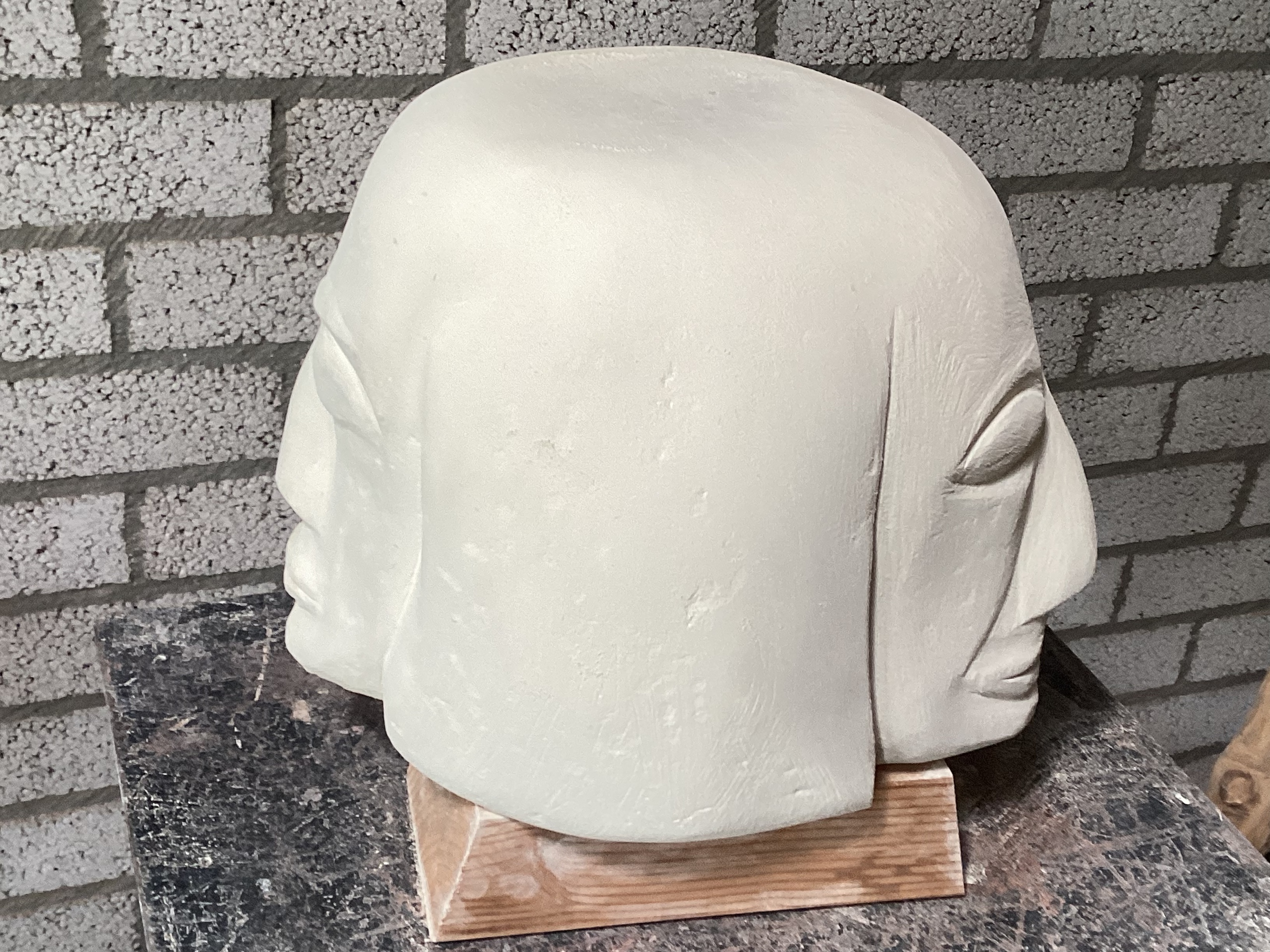 Twee menselijke hoofden, zonder dat het duidelijk is of het een man of een vrouw is. Kalksteen.