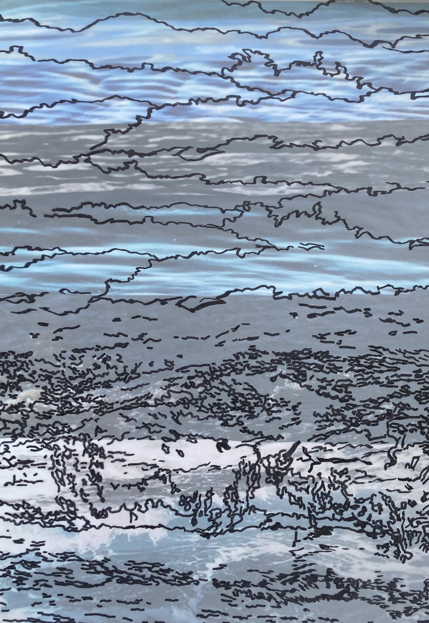 Foto's van water zijn grafisch bewerkt, verknipt, gefotografeerd en/of weer letterlijk bewerkt met collagetechnieken. 59,5 x 80,2
