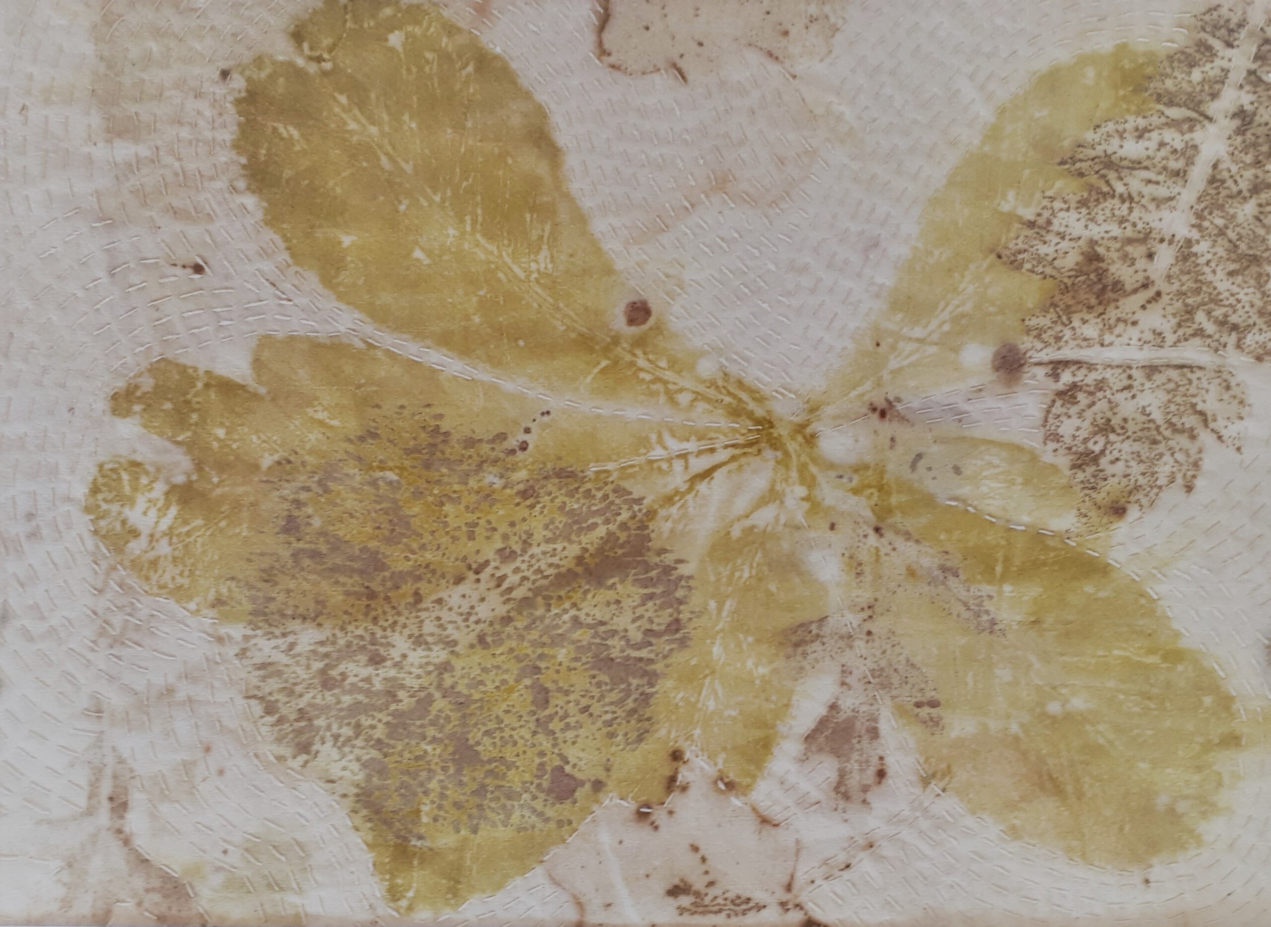 Ecoprint van een kastanjeblad op kantoen met handborduurwerk. Het werk zit in een passepartout met een linnen structuur en een goudkleurig randje aan de binnenkant. Staat mooi in een goudkleurige lijst.
