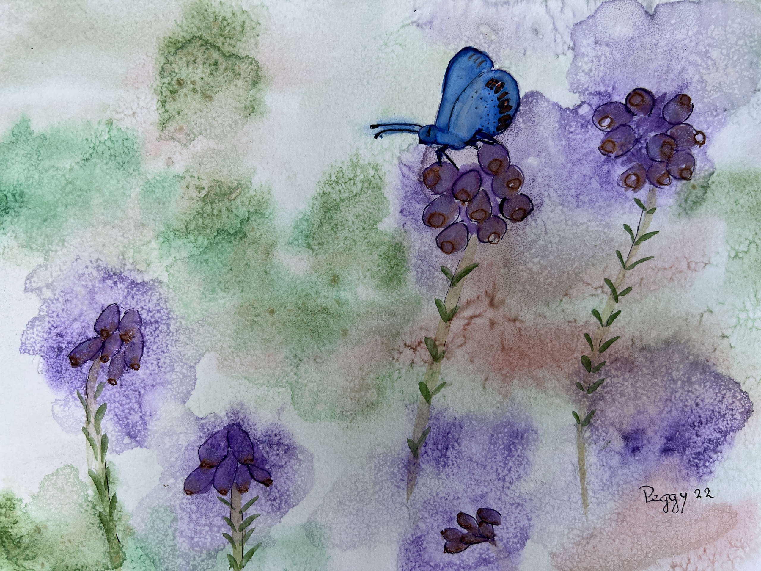 Aangezien ik elke dag uren in de natuur wandel, wilde ik dit op papier en aquarelverf laten zien. Ik wilde anderen laten genieten van de rust die het uitstraalt. De bloemen in het veld, het is zo rustgevend en de blauwe vlinder vliegt door de natuur. Ik heb dit medium gebruikt omdat het zo mooi vloeit en ik weet niet welke kant het op gaat. Ook het gebruik van verschillende soorten zout geeft het een ander structuur aan de aquarel Hoogte 26 cm x bij 36 cm. Je moet het nog inlijsten.