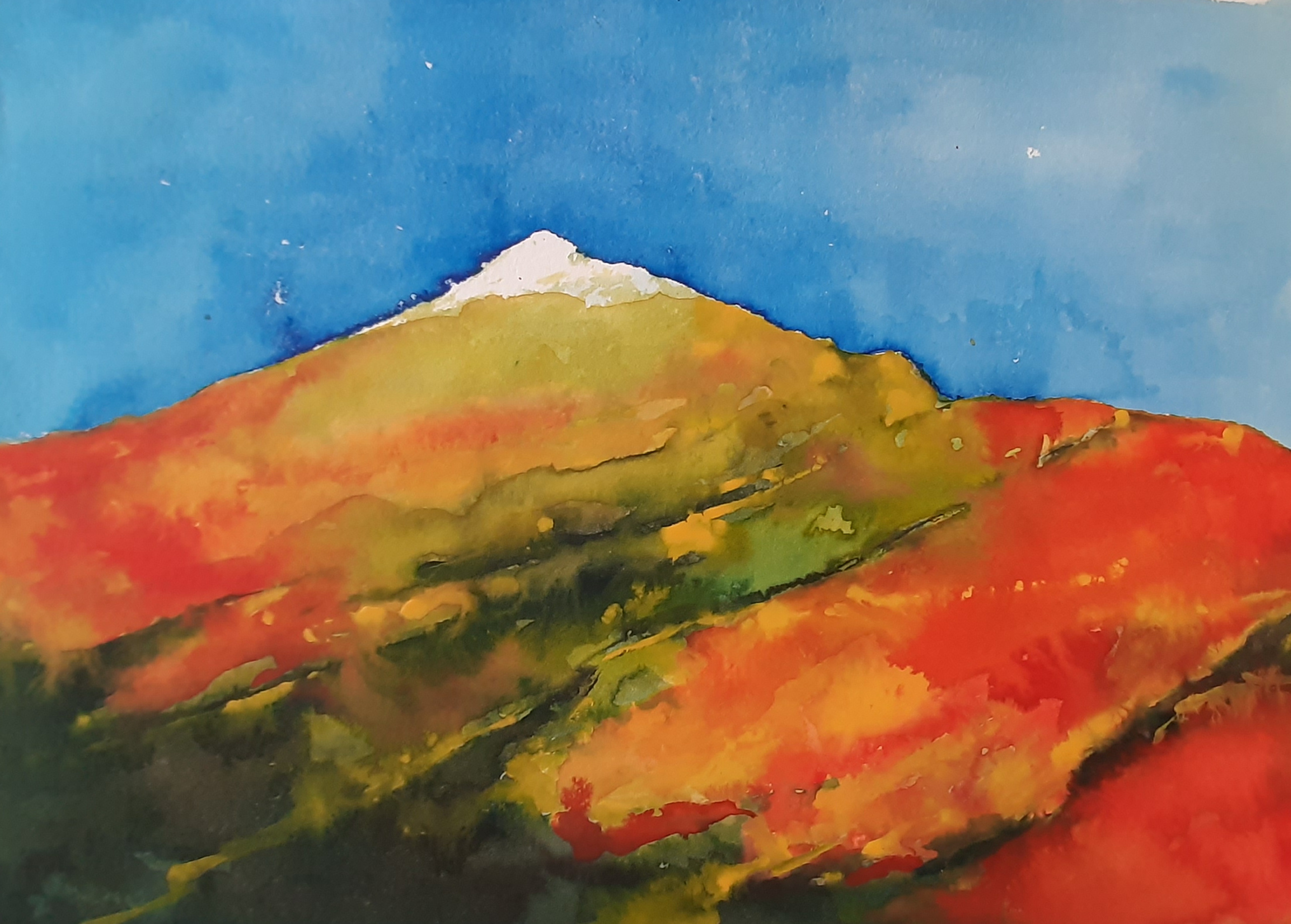 De Mont Ventoux (1909 m.) is een mythische berg in de Franse Provence. Gevreesd door de wielrenners die hem moeten befietsen. De Kale Berg, is zijn bijnaam. En inderdaad: je waant je er op een maanlandschap. Helaas heb ik hem nooit befietst. Wel een paar keer er per auto naar boven geweest. En ook dat maakt indruk. Het kan er spoken, vooral vanwege de ijzige wind. Niet zonder reden: Mont Ventoux. Want het Franse ‘vent’ betekent ‘wind’. De winderige berg, dus. De koning van de Provence. Van verre al zichtbaar. Aquarel op 300grams Canson Montval papier. De vermelde prijs is exclusief passe-partout en/of lijst