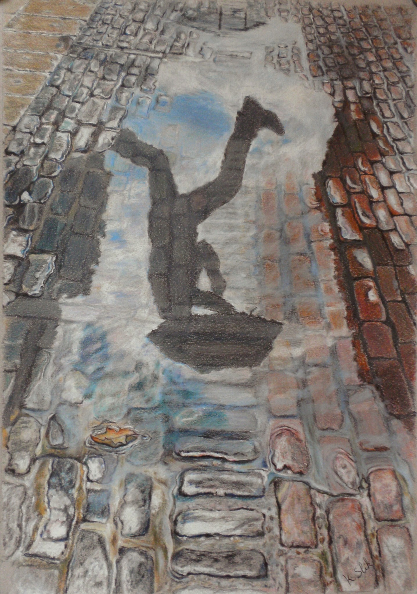 Dit werk kreeg een nominatie in 2018 in de landelijke werdstrijd, tekening van het jaar 2018. Ik heb het, "Keep on Going", genoemd omdat ik in een zware periode zat in die tijd. Door een chronische ziekte kon ik bijna geen activiteiten ontplooien, zelfs tekenen en schilderen was zwaar. Maar ik ben doorgegaan. In de tekening is het slecht weer en zie je een reflectie van iemand die er flink de pas in heeft en over een plas water heen stapt. Toch zie je in de weerspiegeling dat het wolkendek breekt. Het was symbolisch voor me om stug door te gaan. Stap voor stap, soms een grote, soms maar een kleine, en vaak zelfs weer een paar passen terug. Maar hoe dan ook wilde ik moed houden en stug doorgaan, wat mij inderdaad verder heeft gebracht. Inclusief lijst en passe partout van 40 bij 52 cm.