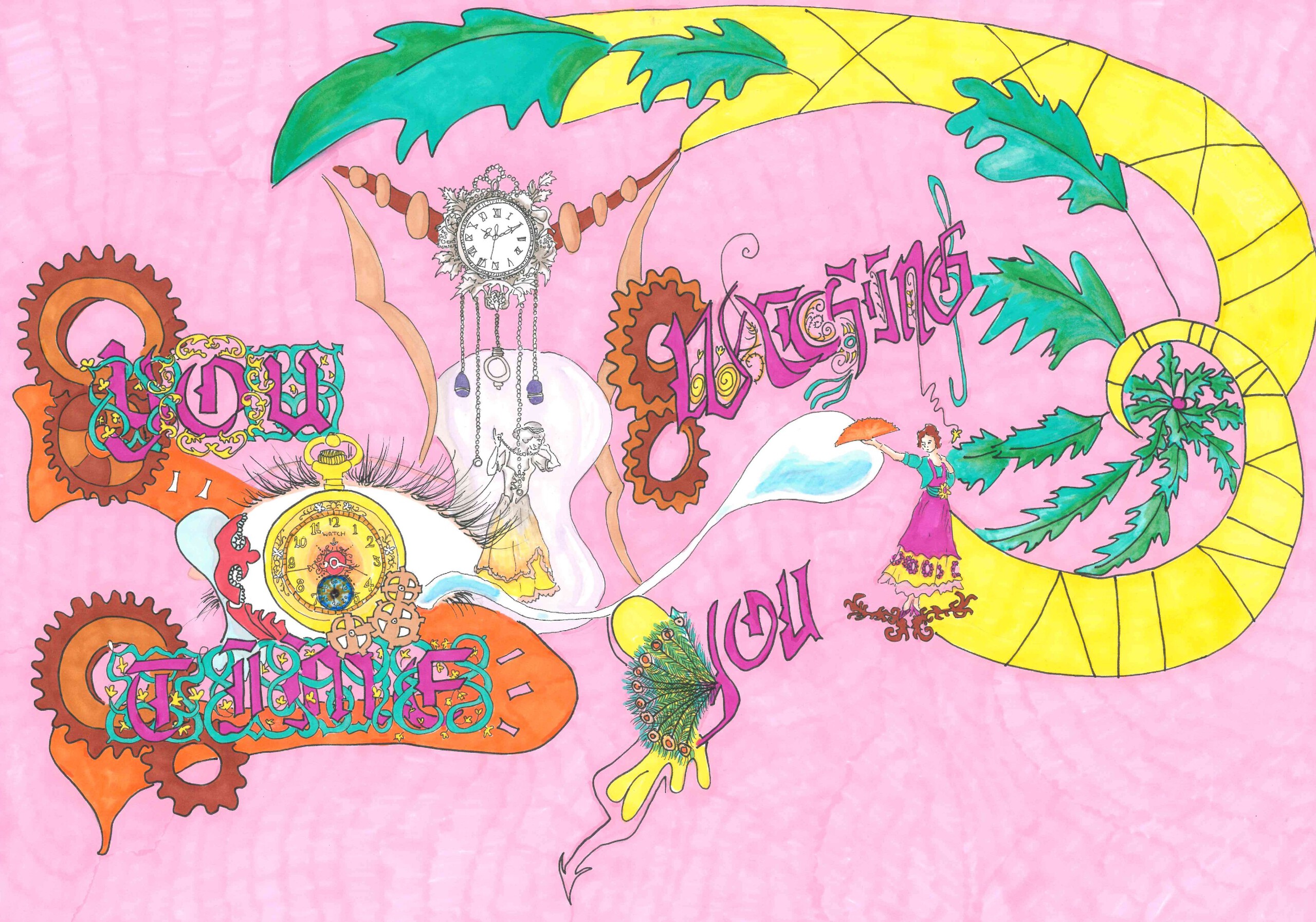 Het oog aan de linkerkant - midden symboliseert het (obsessief) kijken naar de tijd. De vrouw in de zandloper is als het ware 'gevangen' door haar eigen schoonheid. De vrouw aan de rechterkant laat het idee van tijdsbeheersing los, waardoor ze vrij is. Ze wuift het weg en vaart mee met...