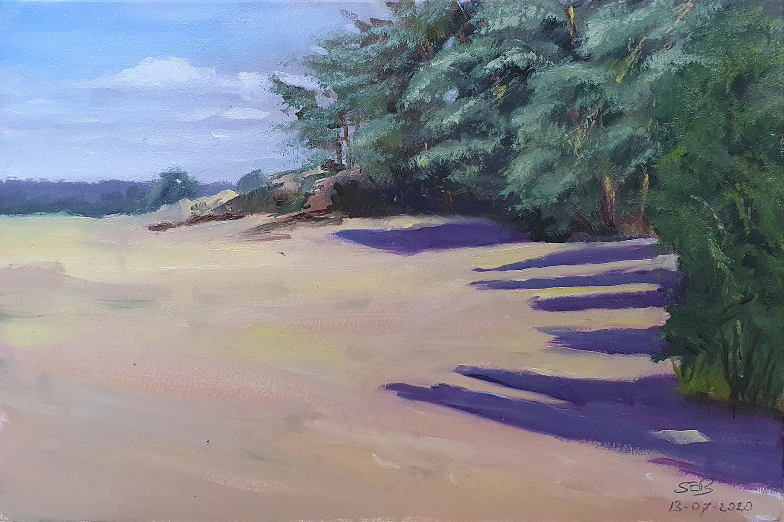 Een olieverflandschap op 4mm MDF, 20 x 30 cm. En plein air op het Kootwijkerzand, in de middag van maandag 13 juli 2020. Voorzien van een ophangsysteem en zwarthouten lijst