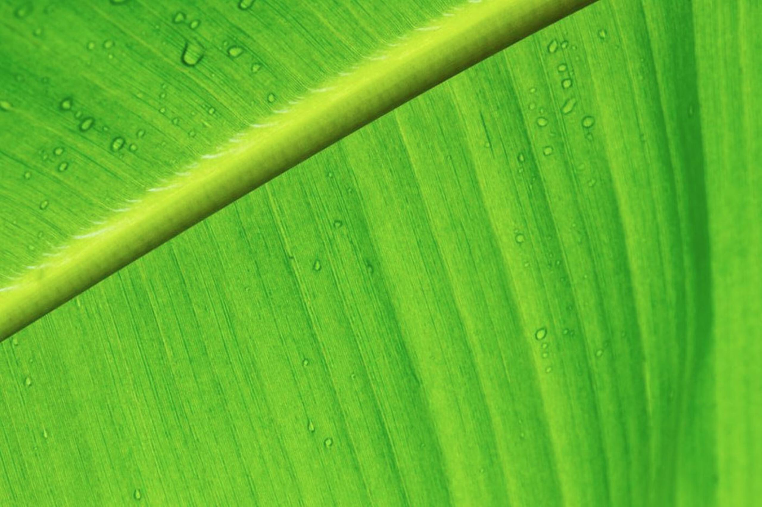 Deze closeup van een enorm blad geeft een goed beeld van de verfijning van het nerfstelsel van deze fraaie plant. De pracht van de eenvoud, de absolute perfectie van de natuur. De druppels schijnen door het transparante groen heen. Het blad geeft bescherming en schaduw. Het werk kan als print geleverd worden in vele formaten (incl. behang) en materialen. (zie qeimoy.com).